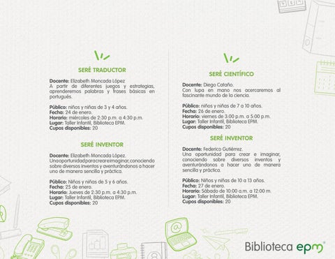 Público: niños y niñas de 7 a 10 años. Fecha: 26 de enero. Horario: viernes de 3:00 p.m. a 5:00 p.m. Lugar: Taller Infantil, Biblioteca EPM. Cupos disponibles: 20