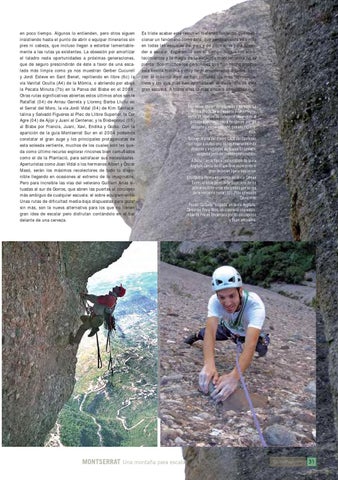 en poco tiempo. Algunos lo entienden, pero otros siguen insistiendo hasta el punto de abrir o equipar itinerarios sin pies ni cabeza, que incluso llegan a estorbar lamentablemente a las rutas ya existentes. La obsesión por amortizar el taladro resta oportunidades a próximas generaciones, que de seguro prescindirán de éste a favor de una escalada más limpia como ya nos muestran Gerber Cucurell y Jordi Esteve en Sant Benet, repitiendo en libre (6c) la vía Vanitat Oculta (A4) de la Mòmia, o abriendo por abajo la Pecata Minuta (7b) en la Panxa del Bisbe en el 2008. Otras rutas significativas abiertas estos últimos años son la Ratafïat (04) de Arnau Garreta y Llorenç Barba Llullu en el Serrat del Moro, la vía Jordi Vidal (04) de Kim Santacatalina y Salvadó Figueres al Plec de Llibre Superior, la Cor Agre (04) de Ajipi y Juani al Centenar, y la Bisbeporuc (05) al Bisbe por Francis, Juani, Xavi, Endika y Goiko. Con la aparición de la guía Montserrat Sur en el 2004 podemos constatar el gran auge y los principales protagonistas de esta soleada vertiente, muchos de los cuales solo les queda como último recurso explorar rincones bien camuflados como el de la Plantació, para satisfacer sus necesidades. Aperturistas como Joan Vidal o los hermanos Albert y Òscar Masó, serán los máximos recolectores de todo lo disponible llegando en ocasiones al extremo de lo imaginable. Pero para increíble las vías del veterano Guillem Arias situadas al sur de Gorros, que abren las puertas al concepto más ambiguo de cualquier escuela: el sobre equipamiento. Unas rutas de dificultad media-baja dispuestas para gozar sin más, son la nueva alternativa para los que no tienen gran idea de escalar pero disfrutan contándolo en el bar delante de una cerveza.