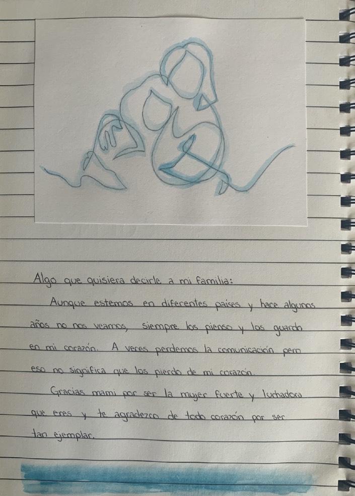 "Sueños y Anhelos: Lo que más quiero es volver al colegio, espero que sea muy pronto porque de verdad no me quiero perder más mi senior year y esto me da muchas ganas de llorar. Quiero volver a reír con mis amigos y a divertirnos como siempre. También sueño con volver a bailar, hace ya mucho que no practico jazz y no se cuando o si volveré a estas clases. Ballet también quiero tener clases ya con barra, presenciales, saltar, corregir, mejorar, quisiera que la academia volviera a abrir, pero no sé si esto llegue a pasar y por lo que veo, en bastante tiempo no será posible. Sueño con volver a la iglesia, a cantar, a ver a las personas, a estar con los niños, a ir a los ensayos. A servir con los niños de la Pastoral Infantil que los extraño mucho, extraño bailar en Alabanzas los fines de semana y de verlos a todos. Siempre esperaba el sábado para ir a la iglesia y lo extraño mucho. También sueño con poder volver a ver a mi familia. Siempre me reía mucho con ellos. Claro que anhelo demasiado poder viajar y ver a mi familia de allá, porque si antes nos veíamos como una vez al año, ahora quien sabe hasta cuando se podrá viajar. También extraño el círculo de oración de los viernes y quiero ya volverlo a hacer presencial. En fin, lo que más anhelo es poder tener mi baile de graduación y la graduación como tal, porque es un momento con el que he soñado toda mi vida y de verdad espero que no se arruine. Quiero usar mi vestido, disfrutar con mis amigos y que sea una noche increíble, como tanto lo hemos planeado y luchado para llegar hasta aquí."