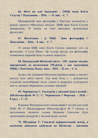 10 липня ЦМБ імені Костя Солухи запрошує усіх на фотосушку «I Love Photo». Це чудова нагода для фотографів ознайомити широкий загал зі своєю творчістю. 68. Центральній бібліотеці міста – 150 : [анонс заходів, приурочених до відзначення 150-річчя з дня заснування МЦБ] // Кам’янець-Поділ. вісн. – 2016. – 22 січ. – С. 6. За весь час існування бібліотека прожила цікаві, а інколи і нелегкі віхи свого життя. Але вона була, є і залишається головною книгозбірнею міста, одним із осередків культурного життя, центром збереження духовних традицій. 69. Чернявська С. Екскурсія у міський відділ поліції : [бібліотека-філія № 7] / С. Чернявська // Фортеця. – 2016. – 8 груд. – С. 12. В рамках Всеукраїнського тижня права 6 грудня для учнів ЗОШ № 17 бібліотекарями бібліотеки-філії № 7 спільно із заступником міського голови Вадимом Савчуком було організовано екскурсію у міський відділ поліції. 70. Шуханова Т. Ухвалили перинатальний центр, а політичні дивіденди здобували на бібліотеці : [питання