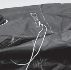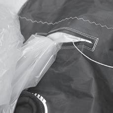 7. Open Velcro at the strut tip and begin to gently pull out the bladder. If you have assistance, one person should hold the canopy taught by the leading handle while the other gently pulls out the bladder. When the bladder is completely out, untie the white bladder strings from the threading string.