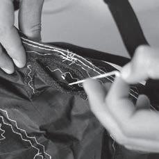 7. Open Velcro at the strut tip and begin to gently pull out the bladder. If you have assistance, one person should hold the canopy taught by the leading handle while the other gently pulls out the bladder. When the bladder is completely out, untie the white bladder strings from the threading string.