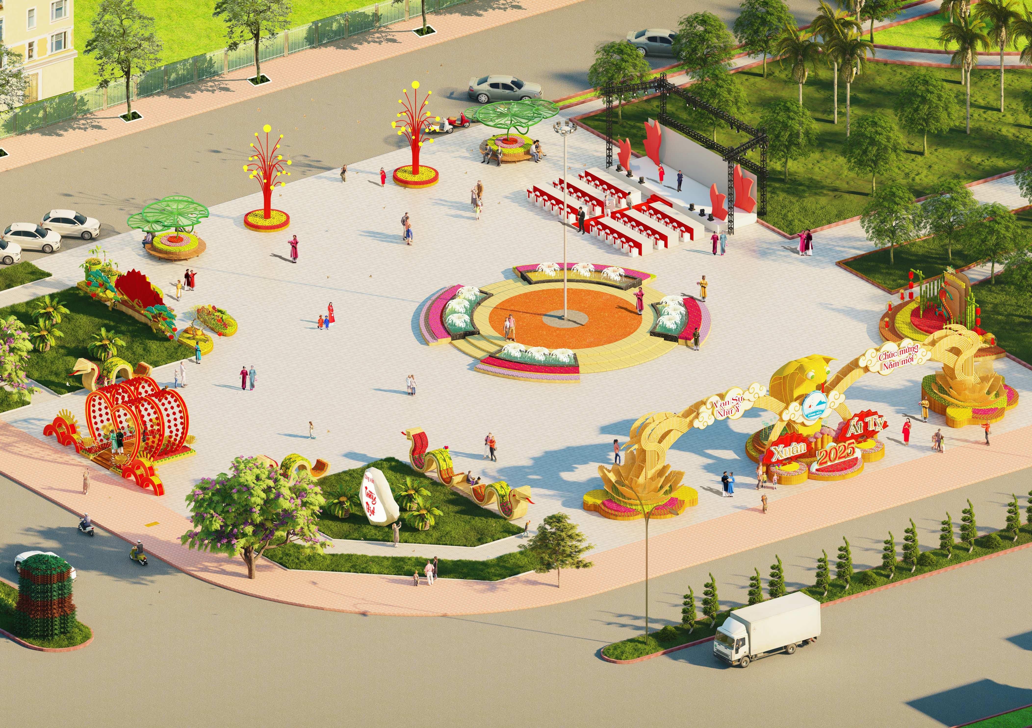 This project is in the middle of a square that belongs to part of Ho Dieu Hoa Ho Son Park. The main aim is to not only represent the Snake mascot with a positive side but also celebrate the Tet holiday in Vietnamese culture. In the present context, there’s a flower-filled Nhan tower in the center of the design area. Besides, Chop Chai Mountain or Turle Mountain can be easily seen from this site Which has a great ponding cultural meaning in Cham culture relating to the snake - Vietnamese 2025-year Mascot.