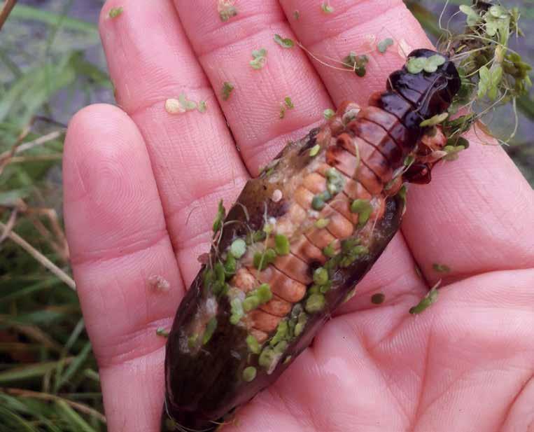 Een sinistere titel! En voor mij was het ook echt even een ‘rilling-over-ruggengraat’ moment, toen ik tussen het onschuldige kroos een vleeskleu rig vreemd ding in mijn schepnetje zag. Ik die nóóit een thriller lees omdat ik dan weken niet slaap, dacht toch in flits: “Gruwel, wat is dit? Een stuk van een lijk?!”. Boswachter, boswachter toch, je fantasie is wel heel keurrijk. Mijn poel-schoonmaak-collega, zich niet bewust van mijn consternatie, meldt terloops dat het de zaaddoos is van de Gele Lis. Oké, ga ik even af!