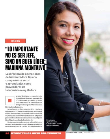 “LO IMPORTANTE NO ES SER JEFE, SINO UN BUEN LÍDER: MARIANA MONTALVO La directora de operaciones de Galvanizadora Tijuana comparte sus retos y aprendizajes como proveedores de la industria maquiladora ariana Montalvo es Ingeniera Industrial y de Sistemas egresada del ITESM Campus Monterrey y cuenta con una Maestría en Administración de Operaciones por la Universidad de Birmingham, Inglaterra. Actualmente es directora operativa y socia de Galvanizadora Tijuana, empresa 100 ciento mexicana que se dedica al galvanizado y recubrimientos de piezas metálicas. Ofreciendo más de 15 tipos de procesos de acabados metálicos, entre los que figuran Zinc, Níquel, Anodizado, Estañado, etc. Desde su entrada a la empresa, la firma ha tenido un gran crecimiento, el cual se traduce en la apertura de una nueva planta en Tijuana, la cual representa un