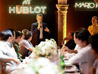 Los asistentes disfrutaron de una elegante noche con aperitivos, bebidas y una cena especial, mientras escuchaban atentamente la presentación de Lucía Calderón, directora de Hublot México. Hublot, pionera en fusionar oro y caucho en relojería, se ha convertido en experta del “Arte de la Fusión”, combinando materiales del pasado, presente y futuro, y uniendo la tradición relojera con un diseño innovador.