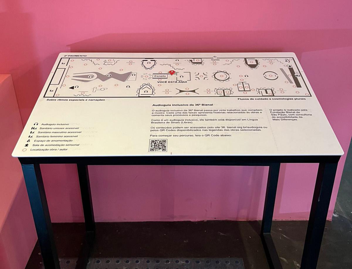 Em todos os pavimentos do pavilhão tem um mapa tátil com informações de localização, serviços e obras com conteúdo acessível daquele andar.