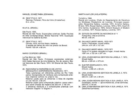 MARA (BRASIL) São Paulo, 1936. Reside em São Paulo. Exposições coletivas: Salão Paulista de Arte Contemporânea; Bienal Nacional 1976. Exposição individual na Galeria Guimar. 27. SEM TíTULO, 1977. Carvão, vidro, acrílico fosco, madeira. 5 seções do painel de vidro do prédio da Bienal. Painel: 120 cm. x 60 cm. MÁRIO CESPEDES (BRASIL) La Paz (Bolivia), 1942. Reside em São Paulo. Principais exposlçoes coletivas: XXIII Salão Nacional de Arte Moderna, Rio de Janeiro; Bienal Nacional de São Paulo, 1974; XIII Bienal de São Paulo, 1975.