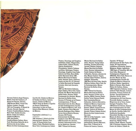 Equador; 19ª Bienal Internacional de São Paulo, São Paulo; 70th International Exhibition of Drawing, Galeria Moderna, Rjjeka, lug,oslávia. 1988 Signs of Transition: 80's Art from Cuba, Museum of Contemporary Hispanic Art (MOCHA), Nova Vork; Raíces en Acción, Museo de Arte Contemporáneo Carrillo Gil, Cidade do México; Bienal de Gráficas, Rijeka, Iugoslávia; Made in Havana, New South Wales Art Gallery, Sidney. 1989 Trajectoire Cubaine, Centro Cultural Pablo Neruda, CorbeilEssonnes, França/ Comuna de Orvieto, Toscana/Comuna de Gibelina, Sicília, Itália; Contemporary Art from Havana, Riverside Studios, Londres; Magiciens de la Terre, Centre Georges Pompidou, Paris. 1990 Bienal de Veneza, Veneza; Arte Contemporáneo de Cuba, Museo de Arte Contemporáneo de Sevilla, Sevilha; Kuba O.K., Stadtische Kunsthalle, Düsseldorf; No Man is an Island, Museu de Belas-Artes, Pori, Finlândia; Among Africas/ln Americas, Walter Phillip Gallery, Banff, Alberta, Canadá. 199115 Artistas Cubanos, Ninart, Centro de Cultura, Cidade do