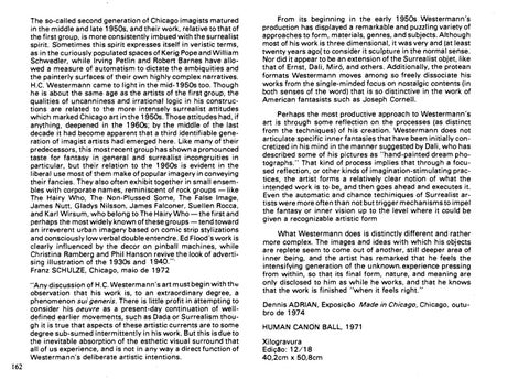 The so-called second generation of Chicago imagists matured in the middle and late 1950s, and their work, relative to that of the first group, is more cons;istently imbued with the surrealist spirit. Sometimes this spirit expresses itself in veristic terms, as in the curiously populated spaces of Kerig Pope and William Schwedler, while Irving Petlin and Robert Barnes have allowed a measure of automatism to dictate the ambiquities and the painterly surfaces of their own highly complex narratives. H.C. Westermann came to light in the mid-1950s too. Though he is about the same age as the artists of the first group, the qualities of uncanniness and irrational logic in his constructions are related to the more intensely surrealist attitudes which marked Chicago art in the 1950s. Those attitudes had, if anything, deepened in the 1960s; by the middle of the last decade it had become apparent that a third identifiable generation of imagist artists had emerged here. Like many of their predecessors, this most recent group has shown a pronounced taste for fantasy in general and surrealist incongruities in particular, but their relation to the 1960s is evident in the liberal use most of them make of popular imagery in conveying their fancies. They also often exhibit together in small ensembles with corporate names, reminiscent of rock groups -like The Hairy Who, The Non-Plussed Some, The False Image, James Nutt, Gladys Nilsson, James Falconer, Suellen Rocca, and Karl Wirsum, who belong to The HairyWho-thefirst and perhaps the most widely known of these groups - tend toward an irreverent urban imagery based on comic strip stylizations and consciously low verbal doub'le entendre. Ed Flood's work is clearly influenced by the decor on pinball machines, while Christina Ramberg and Phil Hanson revive the look of advertising illustration of the 1930s and 194.0.'" Franz SCHULZE, Chicago, maio de 1972 "Any discussion of H.C. Westermann's art must begin with th", observation that his work is, ·to anextraordinary degree, a phenomenon sui generis. There is little profit in attempting to consider his oeuvre as a present-day continuation of welldefined earlier movements, such as Dada or Surrealism though it is true that aspects of these artistic currents are to some degree sub-sumed intermittently in his work. But this isdueto the inevitable absorption of the esthetic visual surround that ali of us experience, andis 'not in any way a direct function of Westermann's deliberate artistic intentions. 162