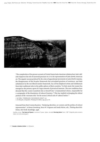 "The complexities ofthe present scenario ofUnited StatesfLatin American relations have had a definite impact on the rale of curatorial practices vis-à-vis the representation ofLatin [North] American art. The organic vacuum praduced by the crisis of oppositional movements in Latin [North] America, the disappearance of the bi-polar framework that articulated practices of resistance, and their substitution by the neo-liberal market framework, has all but displaced artists and intellectuals fram their traditional rales in the public spheres of their countries. 1 ln their stead, the curator has emerged as the primary agent of a large network of privatized interests. The new conditions have dictated that the curator transform him ar herself into 'a transnational citizen, responsible for a cartography of the dissolution of cultural frontiers.'2 This has implied exchanging the ethical position of the 'resistant critic' for the neutral [ethical] rale of'cultural braker.'" See Yúdice, "Globalización e intermediación cultural", n.p. 2. Ivo Mesquita, CartoBraphíes, Winnipeg Art Gallery, 1993, PP.13-62.