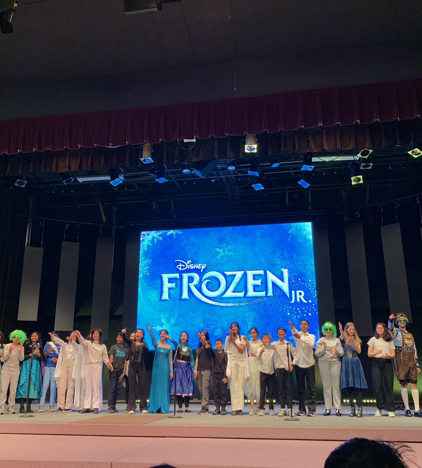 and the digital backdrops created an immersive atmosphere throughout the story. The cast, made up of middle and high schoolers, performed each scene and number exceptionally well, embodying their characters onstage. The songs, featuring some favorites such as “Let It Go”, “Love is an Open Door”, and “Do You Want to Build a Snowman?”, as well as new ones such as “A Little Bit of You” and the very energetic and catchy “Hygge”, showcased many talented voices amongst our student body. The audience laughed, cried, cheered, and clapped as the themes of love, family, and acceptance were portrayed through breathtaking and emotional performances, such as Samhita M.’s (11) performance of “Let It Go” as Elsa, and humorous performances, like KaiRi H.’s (7) solo number, “In Summer”, as Olaf and “Fixer Upper” performed by the fluorescent green-haired troll ensemble. At the end of the show, the entire cast and crew came onstage for