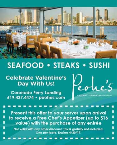 Crown Bistro Restaurant 619-435-3678 | CrownBistro.com 520 Orange Avenue 3-COURSE MEAL $1995 Chef’s Choice Entree, Soup or Salad + Dessert Valid Monday - Saturday. Must present coupon when ordering. Not valid with any other o ers. Expires 2-28-17 cc person INCLUDES A BOTTLE OF WINE $65 Per Couple 4-COURSE MEAL Chef’s Choice Entree, Soup or Salad + Dessert Valid Monday - Saturday. Must present coupon when ordering. Not valid with any other o ers. Expires 2-28-17 cc February 18 6 - 8 pm $55 per person (plus tax & gratuity) Reservations Required. Space limited. RSVP today. A TASTE OF SPAIN FOUR-COURSE WINE DINNER VALENTINE’S DAY SPECIAL MENU February 14 5 - 9 pm Treat your someone special to a romantic dinner. Make your reservation today! Full set of the best quality natural-looking lashes available! The health of your natural lashes is my highest priority! $49 Call for an Appointment. New Clients Only, Please. Expires 2/28/17 Regular Price $95 $59 Call for an Appointment. New Clients Only, Please. Expires 2/28/17 Regular Price $95 KRISTINE VERA (321)720-3110 New Year Massage Special! LASH EXTENTIONS Full Set $85 SOFIA CAPLANERIS (619)481-8525 Call for an Appointment. New Clients Only, Please. Expires 2/28/17 Regular Price $150 www.kvera.massagetherapy.com FACIAL with Microdermabrasion + Rejuvenation Hydration Mask + Extractions JANIE SHAW (619)985-0906 1123 TENTH AVE CORONADO TREAT YOURSELF FOR VALENTINE’S DAY! KVERA Massage and Bodywork