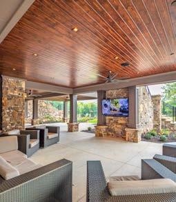 The Lower Patio offers a spacious, covered outdoor area perfect for casual gatherings, cocktail hours, or as an extension of an event on the lawn. With its wood-paneled ceiling, stone accents, and ceiling fans for comfort, this versatile space provides shade and shelter while still embracing the surrounding mountain and lake views.