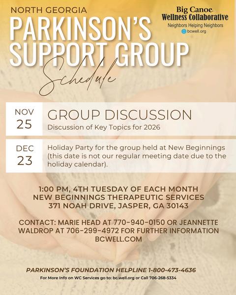 1:00pm,4thTuesdayofeachmonthNew BeginningsTherapeuticServices371NoahDrive, Jasper,GA30143.Contact:MarieHeadat770940-0150orJeannetteWaldropat706-299-4972 forfurtherinformationbcwell.com