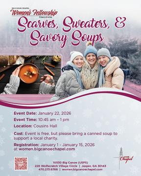 WFScarves,Sweaters,andSavorySoups-Plantojoinusfor thisWomen'sFellowship2026Kickoffevent!Wearyour favoritescarvesand/orsweatersandenjoyfabulous fellowship.Servingsavorysoups,crudité,Frenchbreadand Texassheetcake,thereisnocosttoyou!Bringacanofsoup tosupportalocalcharity
