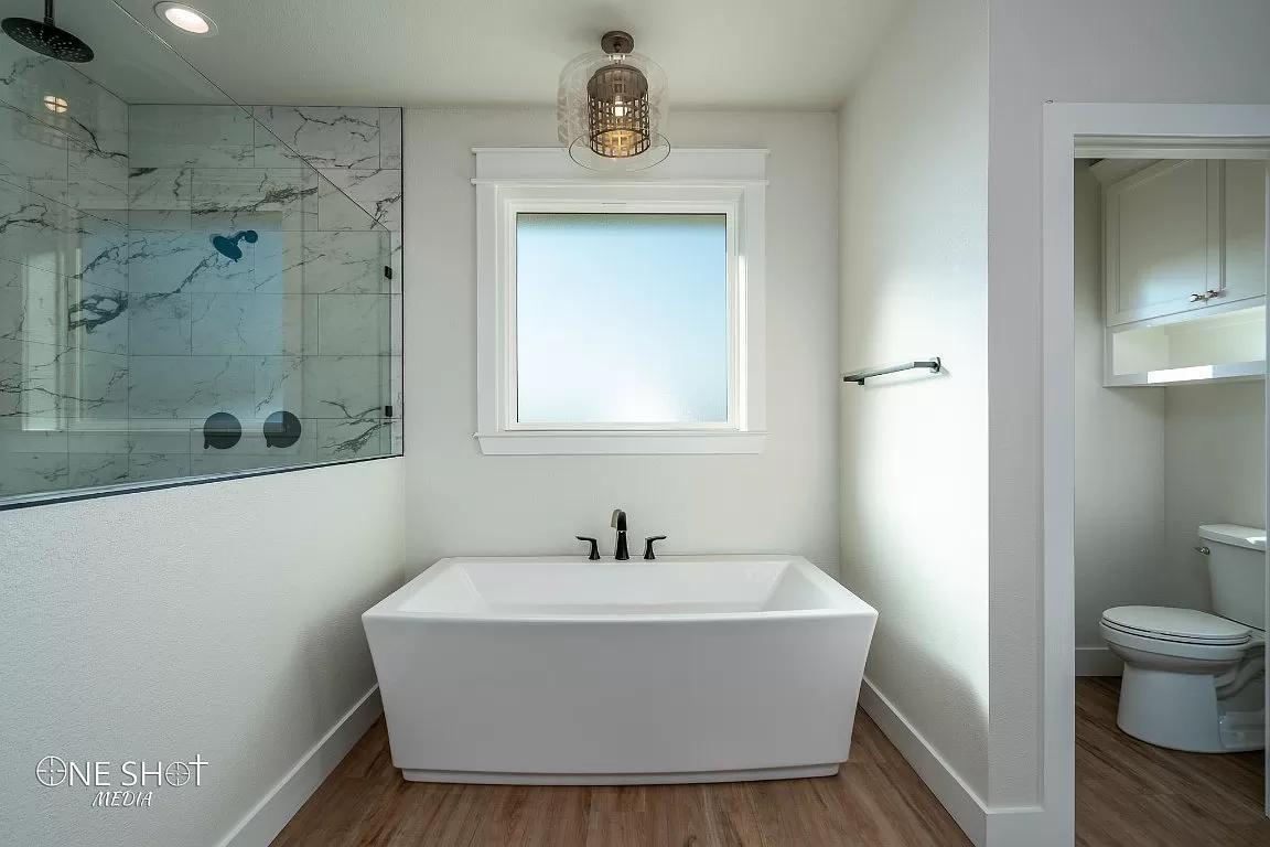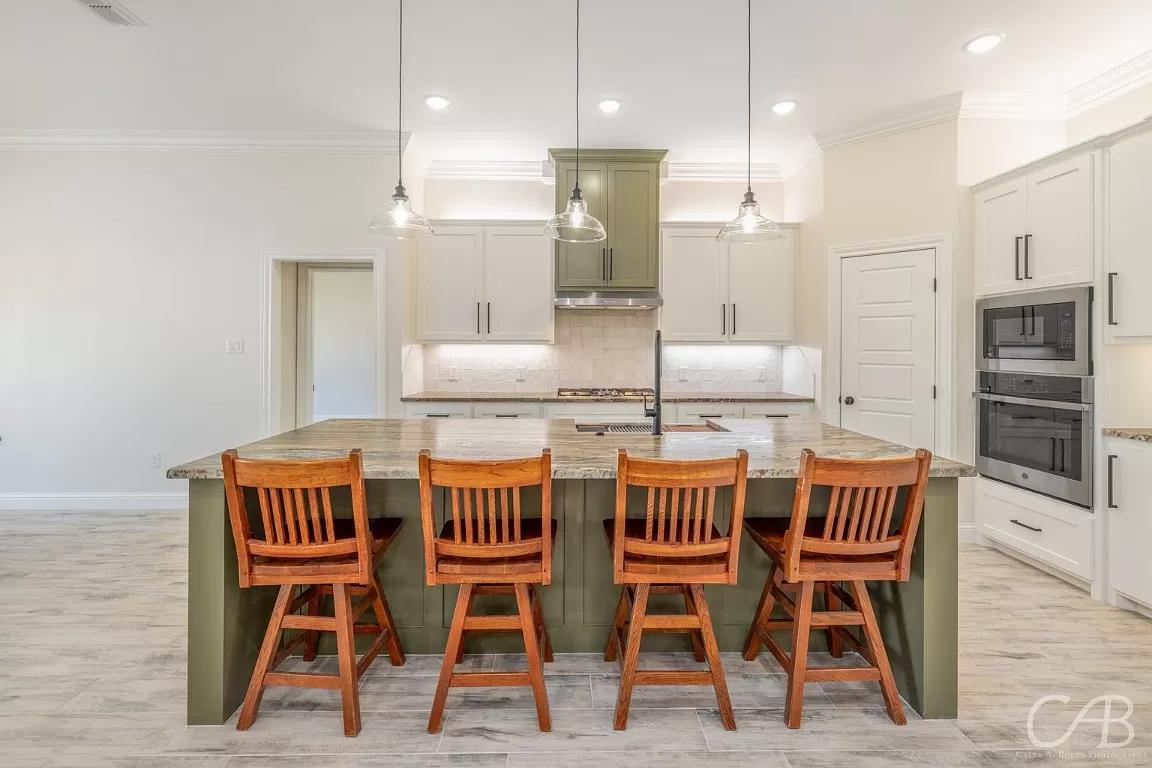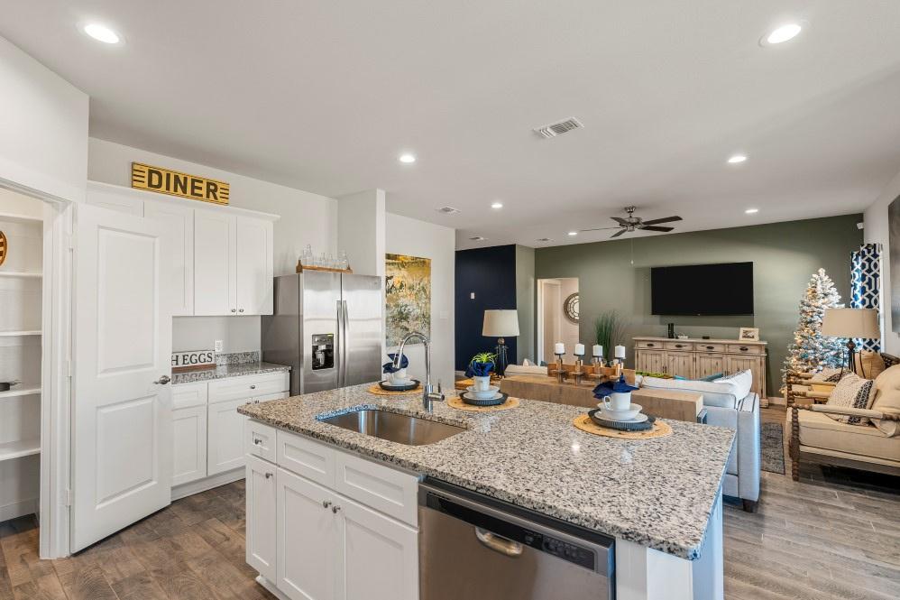 THE MODEL HOME BY LANTRIP’S CUSTOM HOMES SHOWCASES A SPACIOUS KITCHEN WITH CUSTOM CABINETRY, AN ISLAND WITH A SINK, AND A CORNER PANTRY. ADDITIONALLY, IT BOASTS AN ENSUITE WITH A FREE-STANDING TUB, SEPARATE SHOWER, AND A WALK-IN CLOSET, ALONG WITH A LARGE COVERED BACK PORCH.