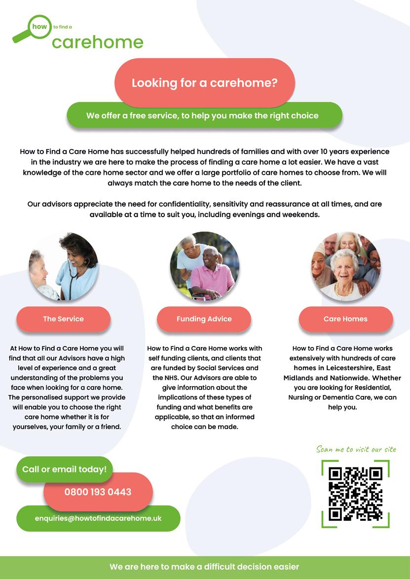If you live in the county and need more information and advice on adult social care visit www.leicestershire.gov.uk/contactadult-social-care