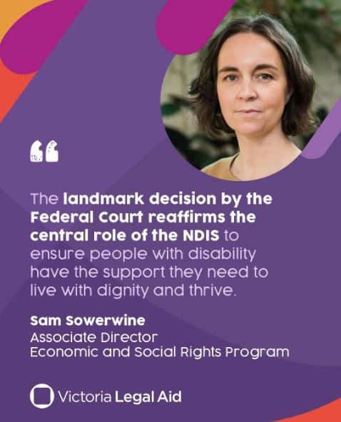 This case may have implications for people who have been found ineligible for the NDIS because they access other systems as well, like accident and injury compensation schemes and schemes that provide smaller amounts of funding. Associate Director Sam Sowerwine said in a Victoria Legal Aid press release; “People with disability already experience a range of barriers to living with dignity in the community. They should not face the burden of having to show that all of their support needs cannot be met by other services just to access the NDIS, particularly when available services might also depend on location, can change over time or be cut in the future”.