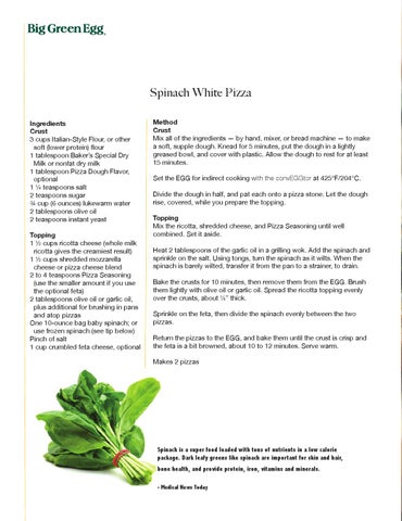 Method Crust Mix all of the ingredients — by hand, mixer, or bread machine — to make a soft, supple dough. Knead for 5 minutes, put the dough in a lightly greased bowl, and cover with plastic. Allow the dough to rest for at least 15 minutes. Set the EGG for indirect cooking with the convEGGtor at 425°F/204°C. Divide the dough in half, and pat each onto a pizza stone. Let the dough rise, covered, while you prepare the topping. Topping Mix the ricotta, shredded cheese, and Pizza Seasoning until well combined. Set it aside. Heat 2 tablespoons of the garlic oil in a grilling wok. Add the spinach and sprinkle on the salt. Using tongs, turn the spinach as it wilts. When the spinach is barely wilted, transfer it from the pan to a strainer, to drain. Bake the crusts for 10 minutes, then remove them from the EGG. Brush them lightly with olive oil or garlic oil. Spread the ricotta topping evenly over the crusts, about ¼” thick. Sprinkle on the feta, then divide the spinach evenly between the two pizzas. Return the pizzas to the EGG, and bake them until the crust is crisp and the feta is a bit browned, about 10 to 12 minutes. Serve warm. Makes 2 pizzas