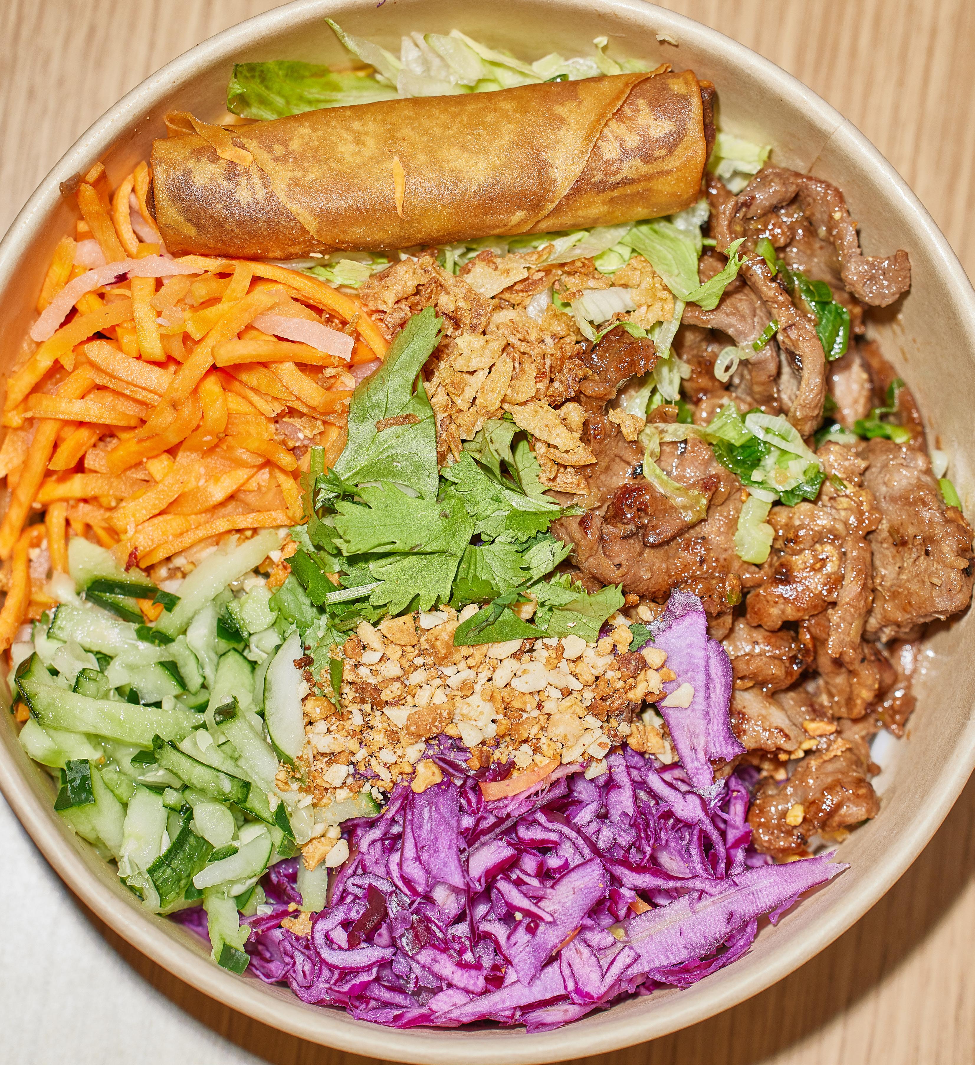 We love the filling and fresh vermicelli bowl at DD Mau. It’s a pile of noodles served with red cabbage, lettuce, pickled veggies and cucumbers topped with crunchy peanuts and crispy shallots. The bao sliders, also available in a vegetarian option, have a soft, sweet bun with veggies, red cabbage, pickles and cilantro.