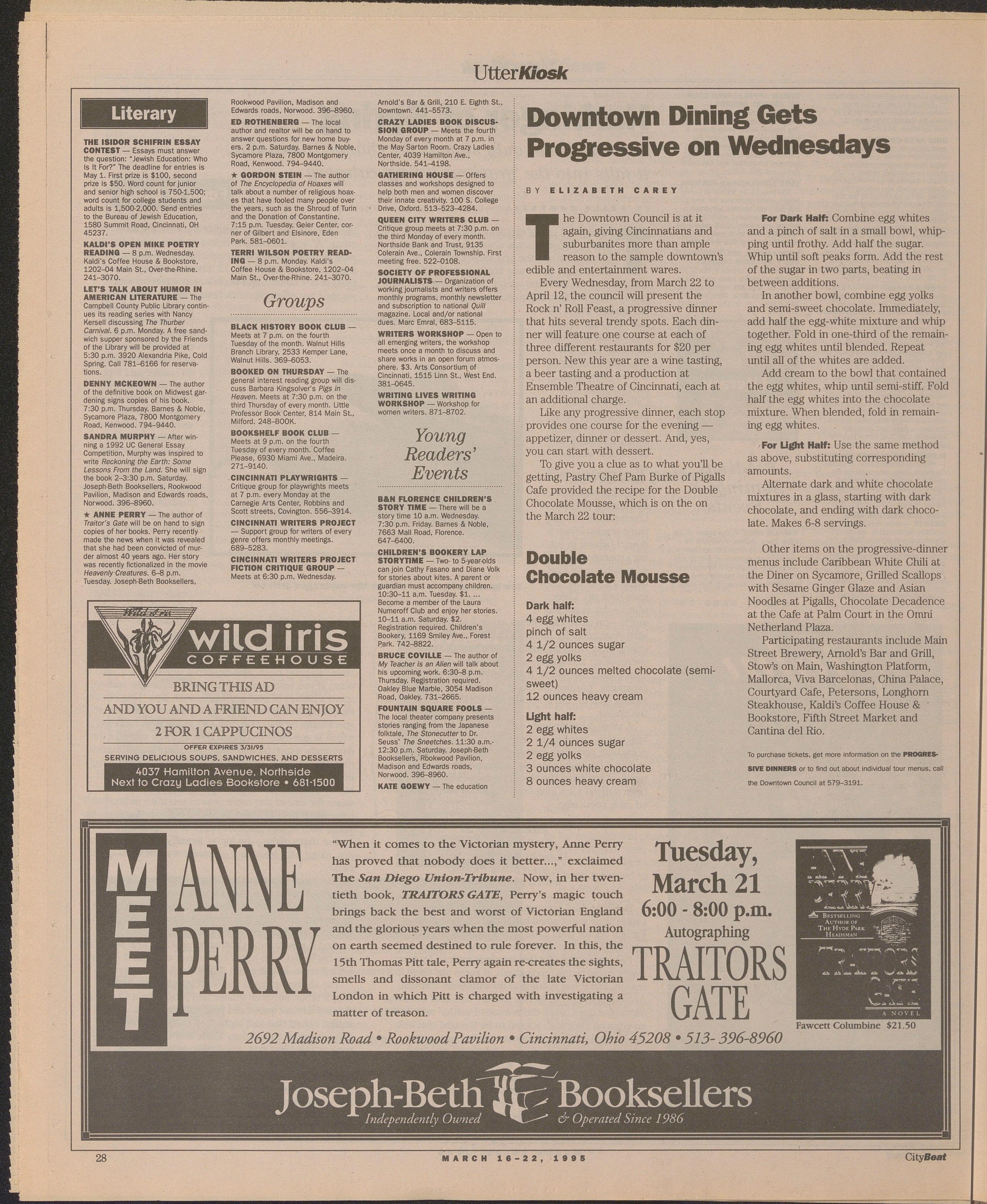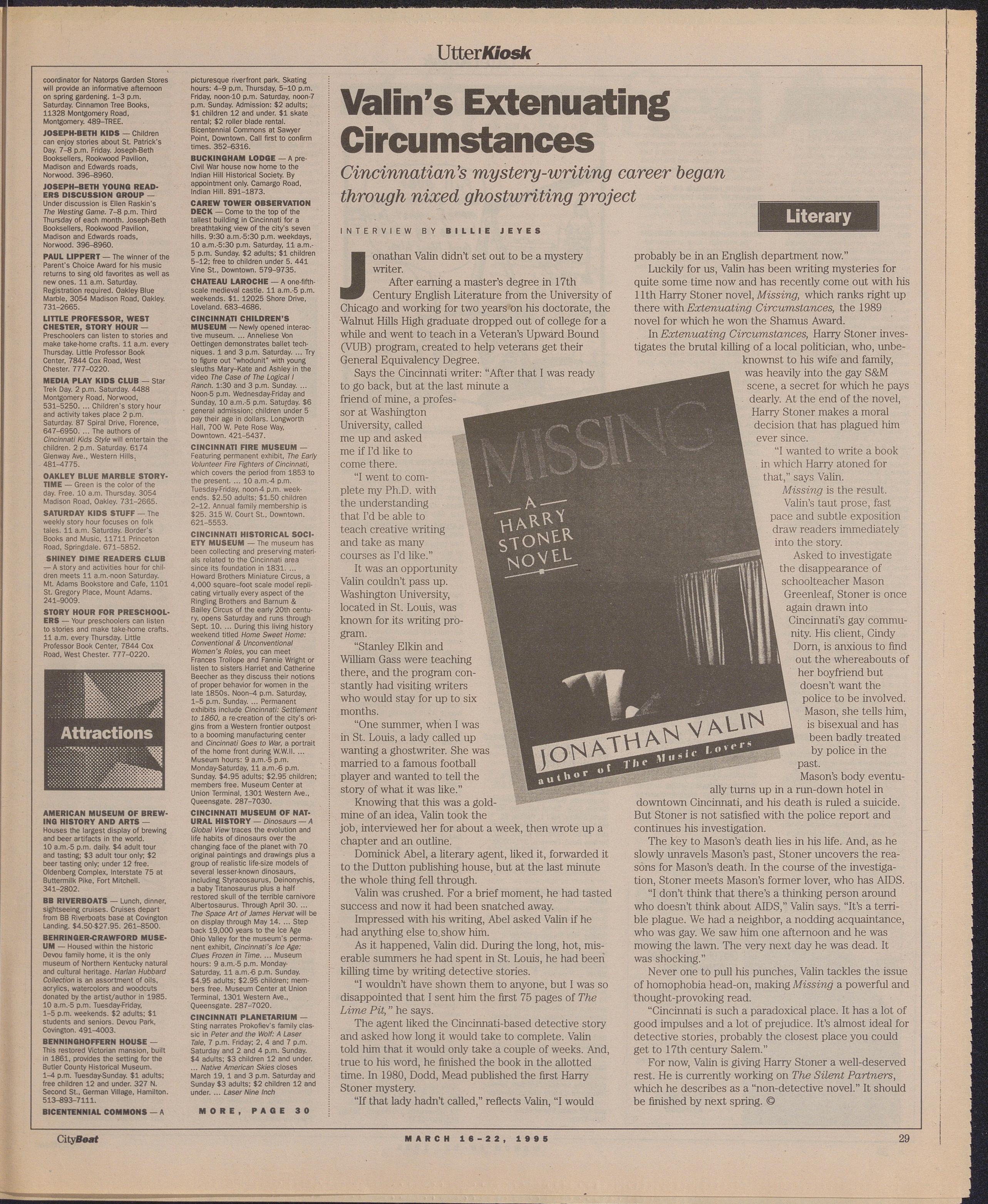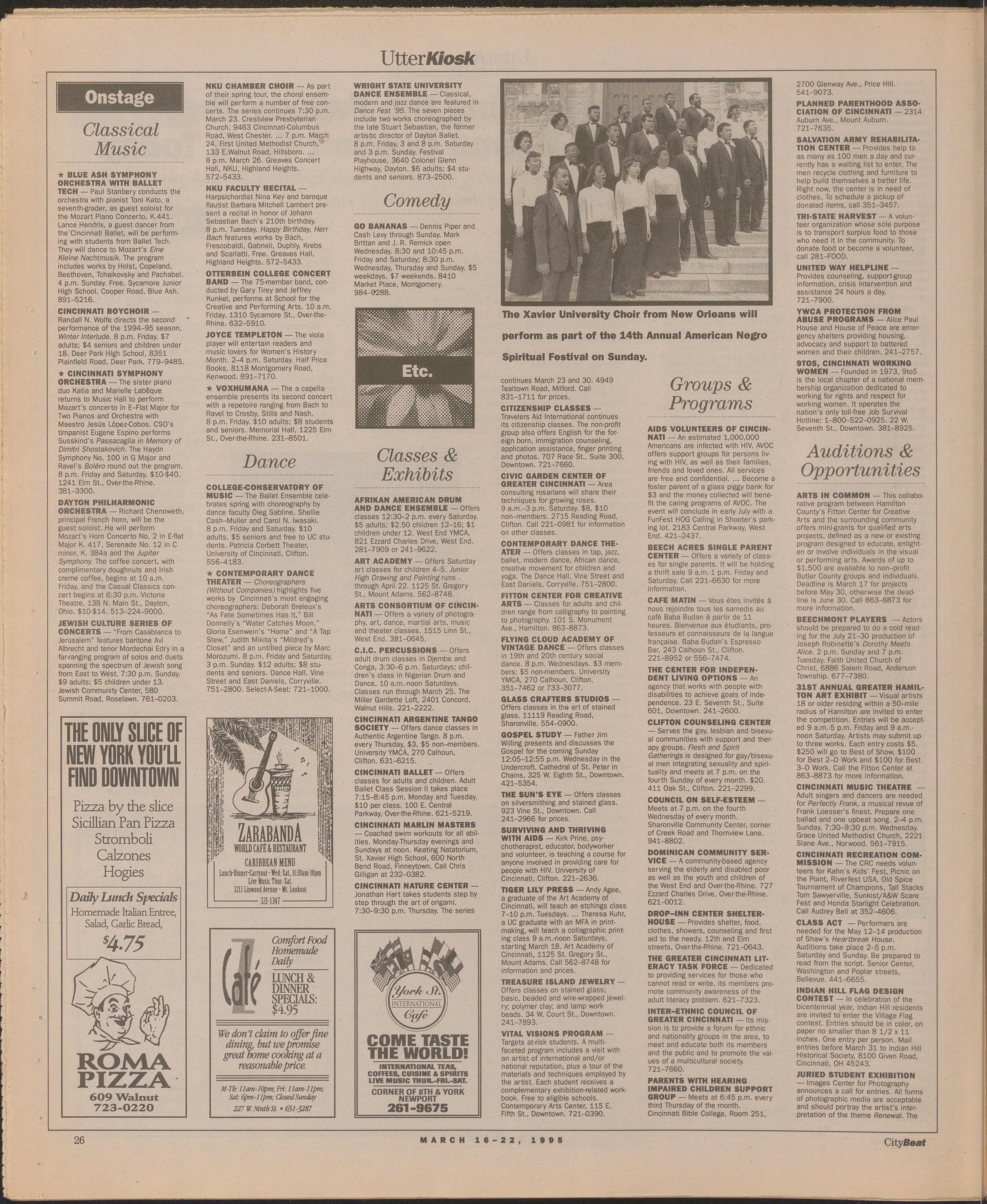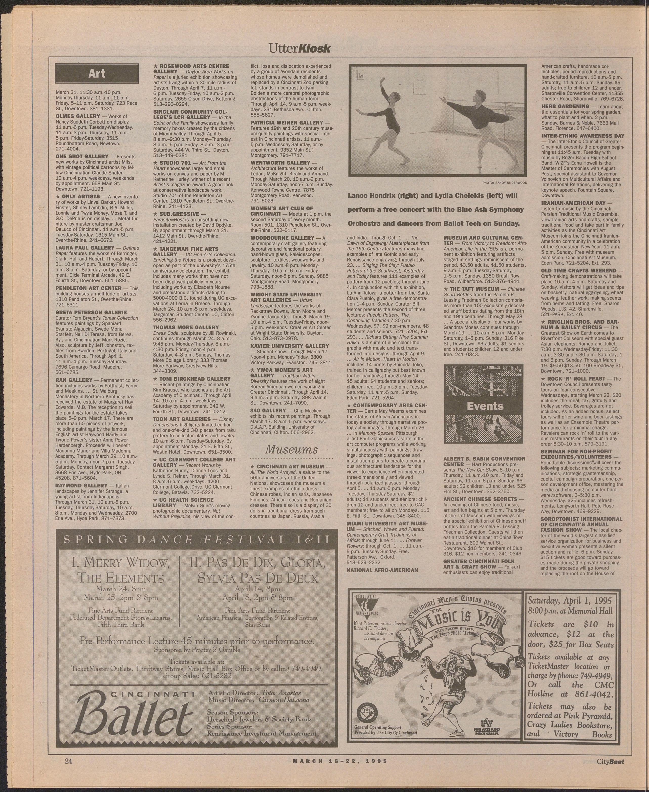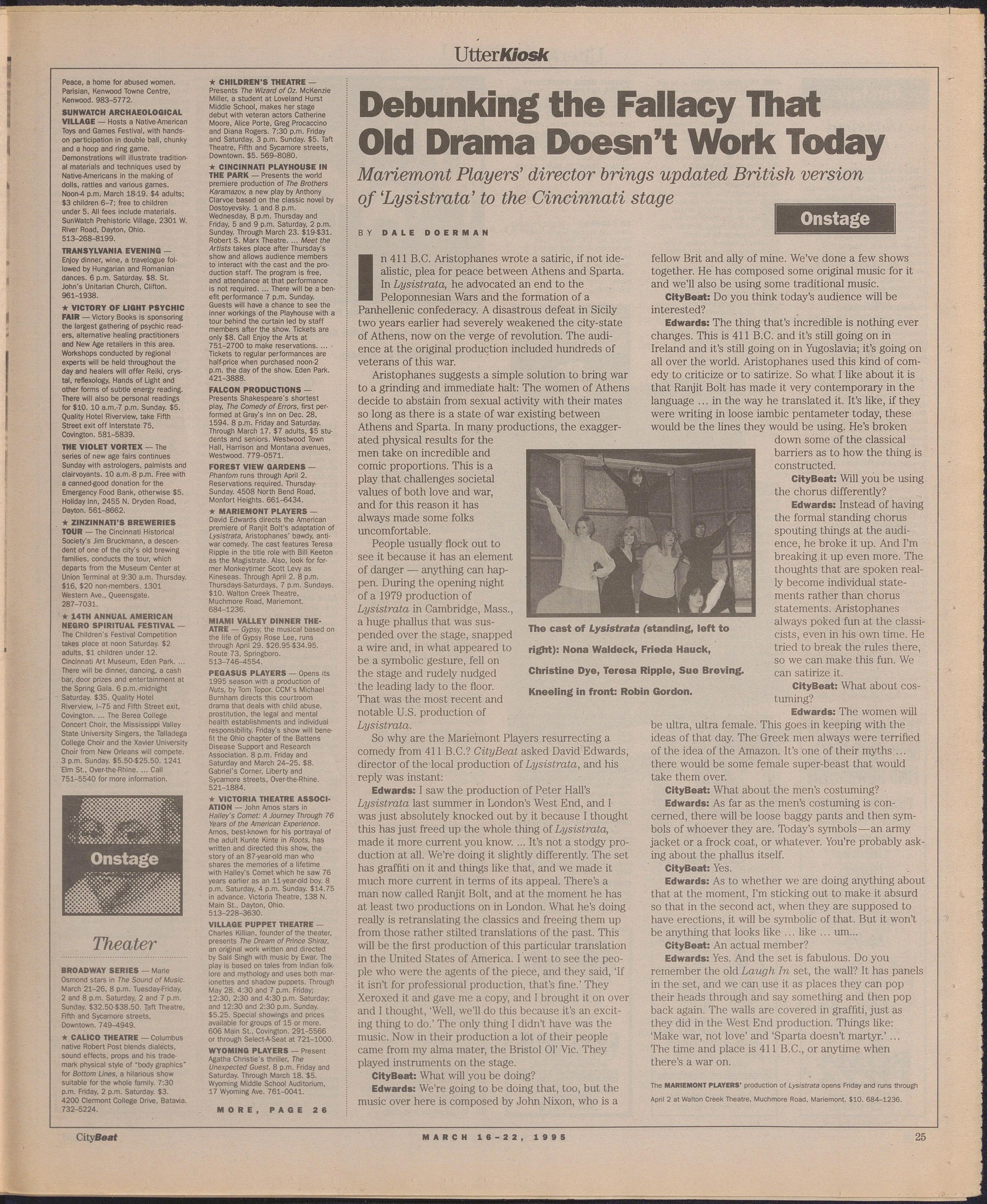 contributing editors Mike Breen, Music; Dale Doerman, Onstage; Billie Jeyes, Literary; Rick Pender, Onstage; Steve Ramos, Film; Fran Watson, Art.