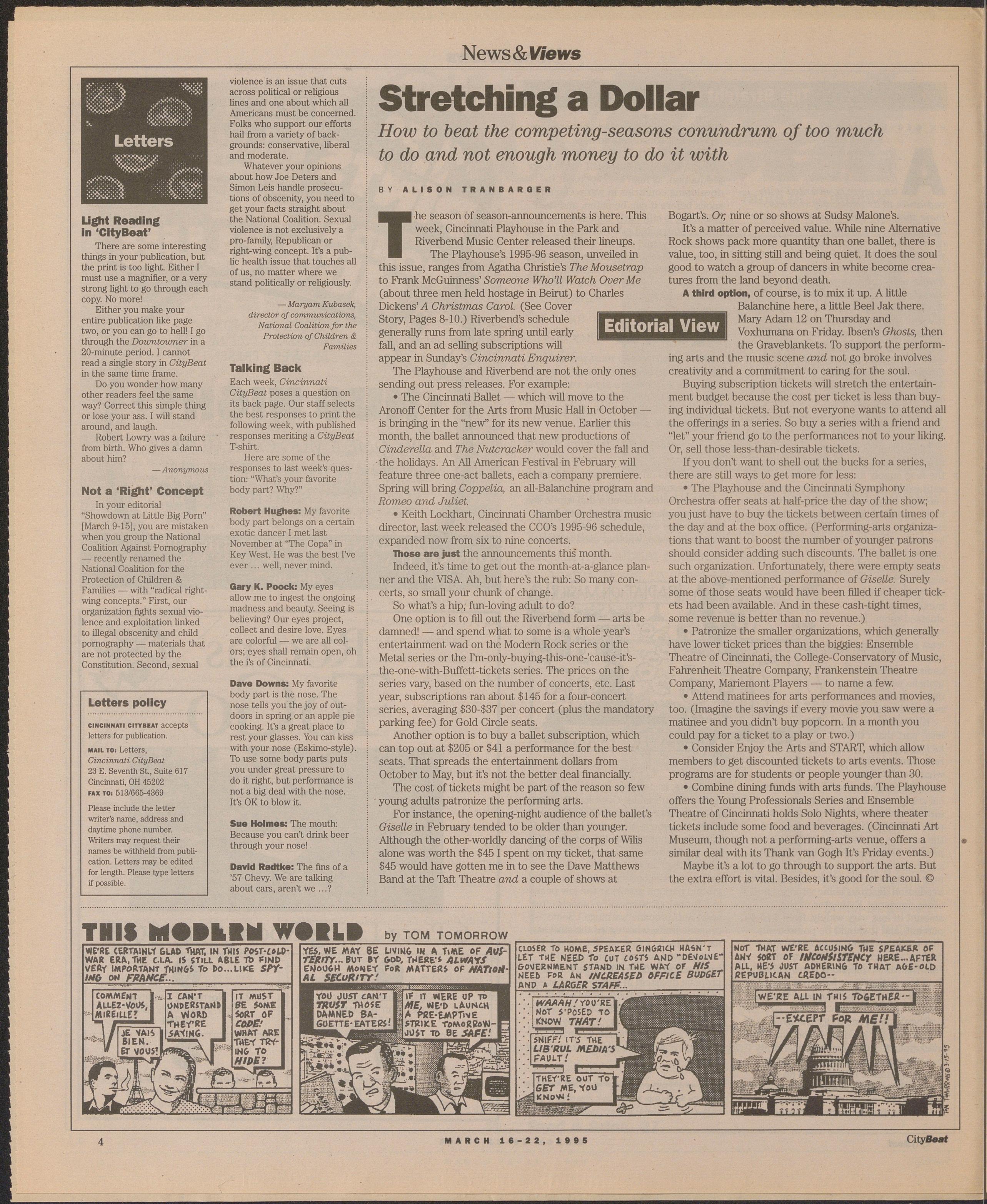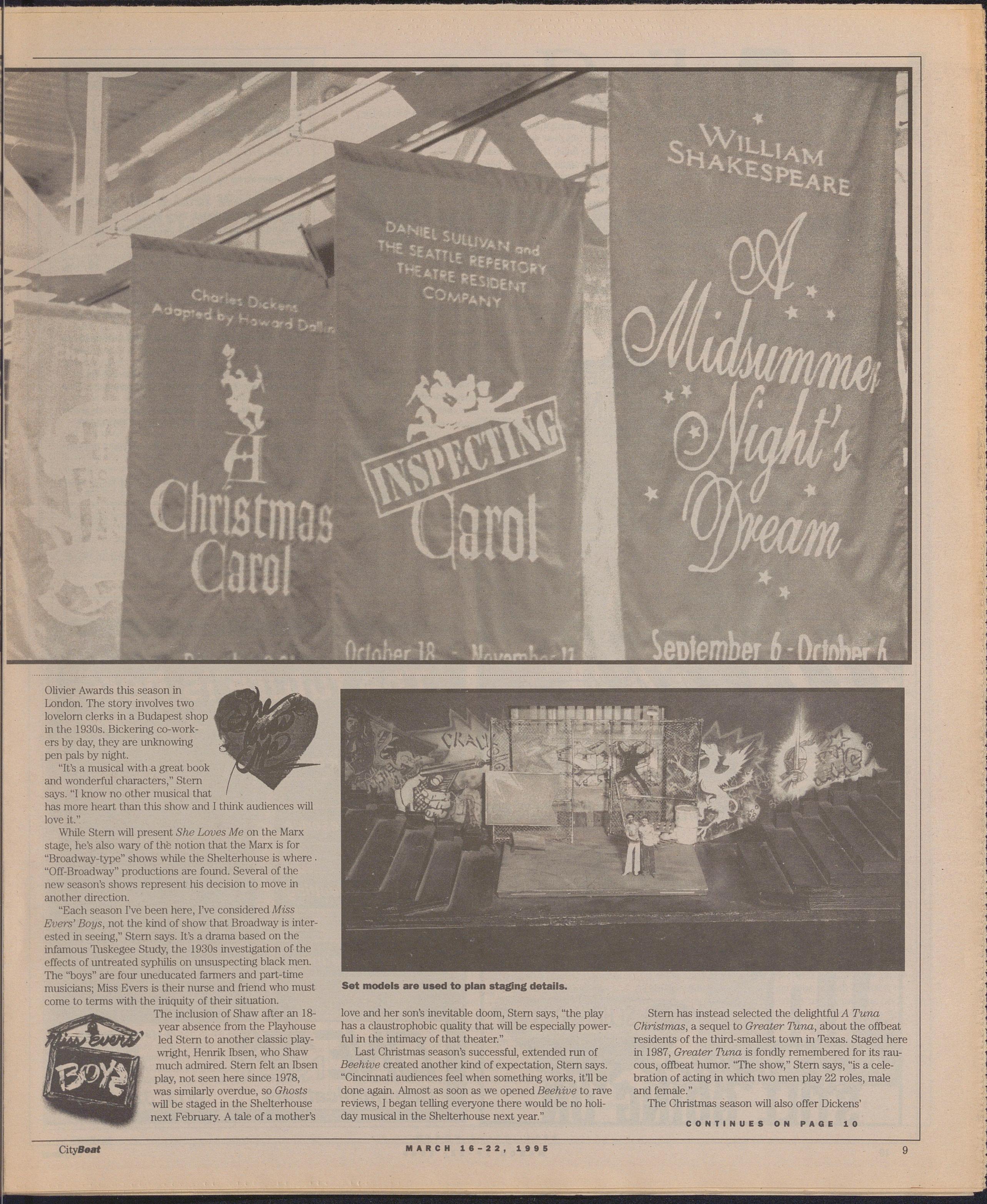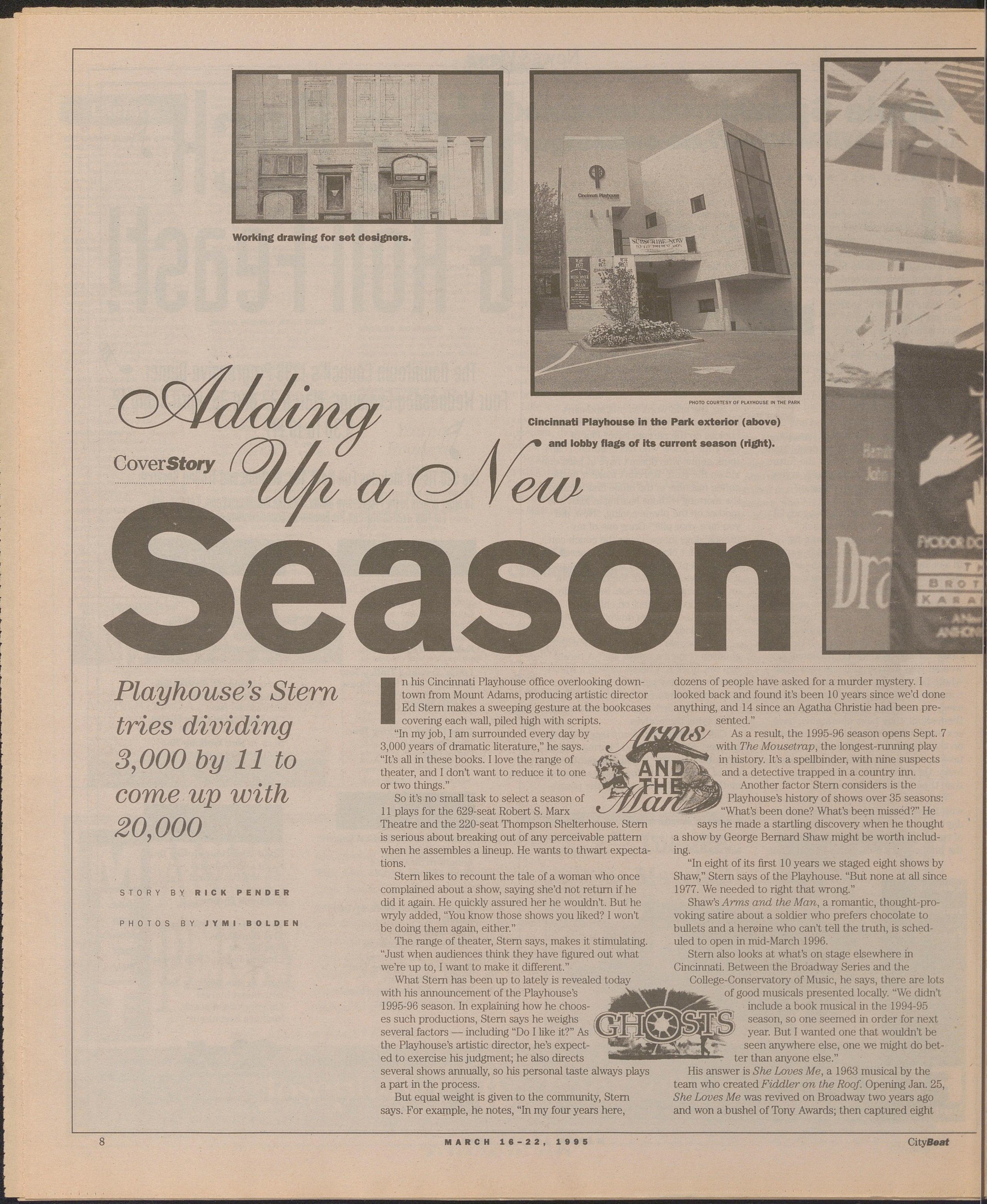The season of season-announcements is here. This week, Cincinnati Playhouse in the Park and Riverbend Music Center released their lineups. The Playhouse’s 1995-96 season, unveiled in this issue, ranges from Agatha Christie’s The Mousetrap to Frank McGuinness’ Someone Who’ll Watch Over Me (about three men held hostage in Beirut) to Charles Dickens’A Christmas Carol. (See Cover Story, Pages 8-10.) Riverbend’s schedule generally runs from late spring until early fall, and an ad selling subscriptions will appear in Sunday’s Cincinnati Enquirer.
