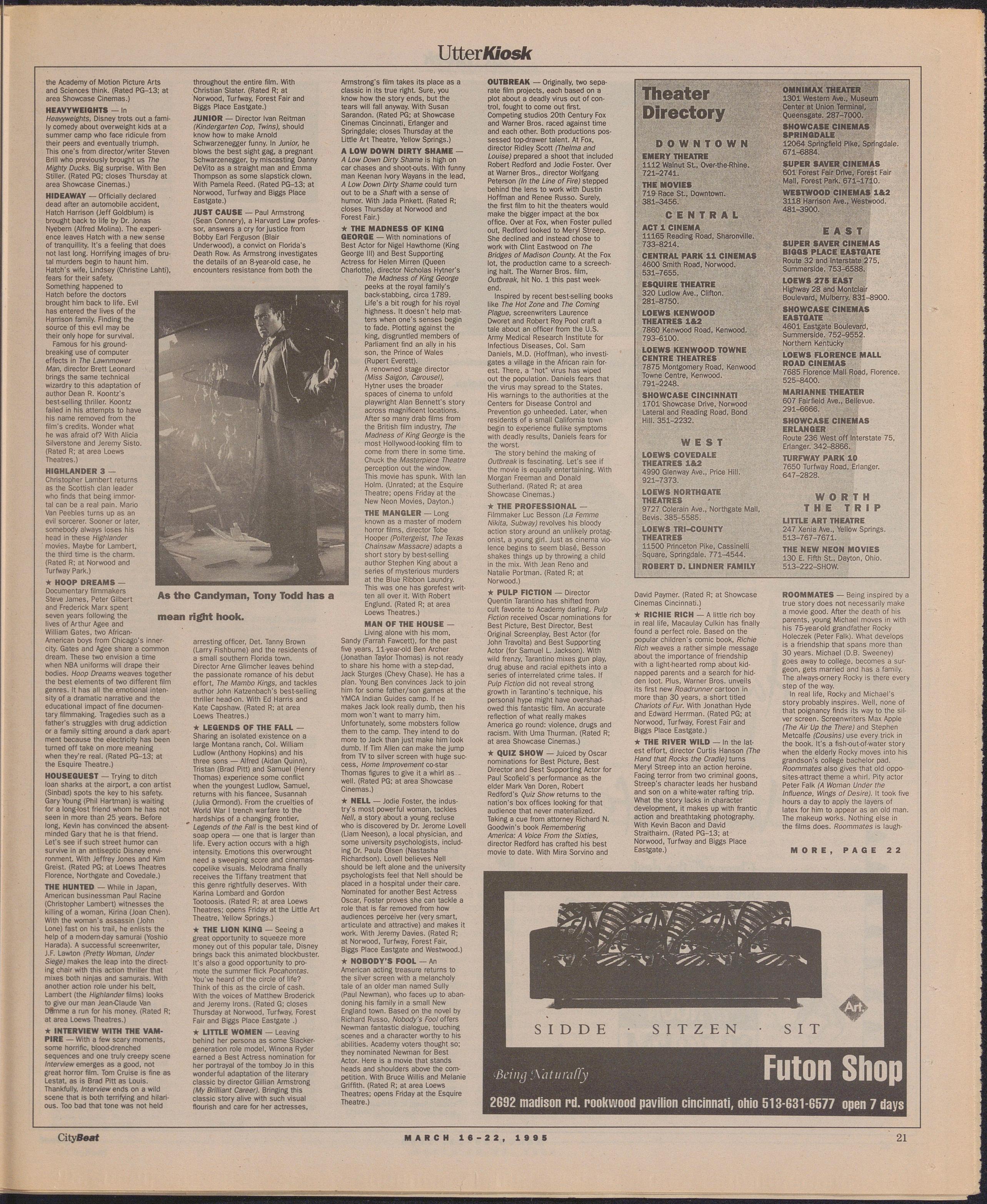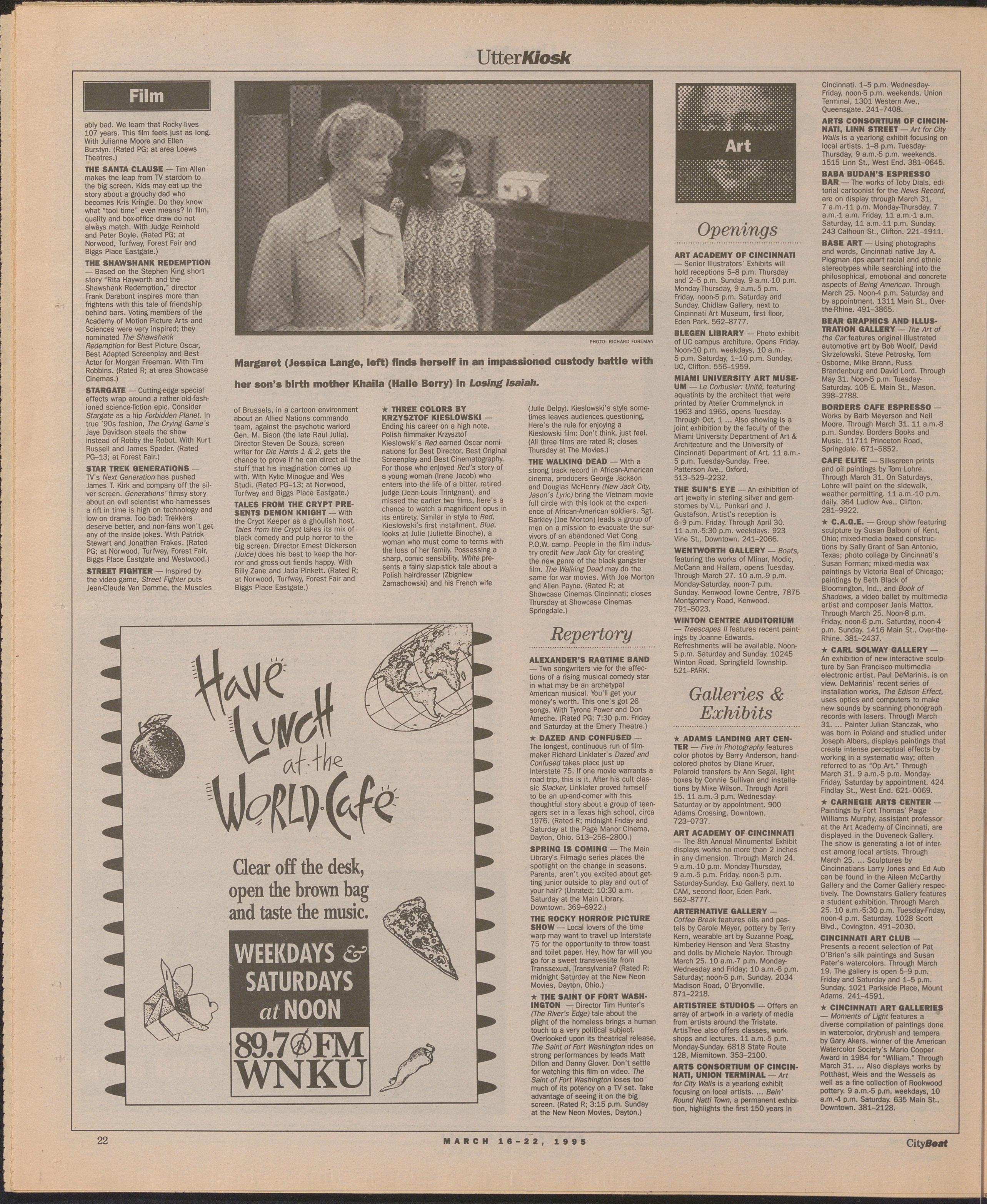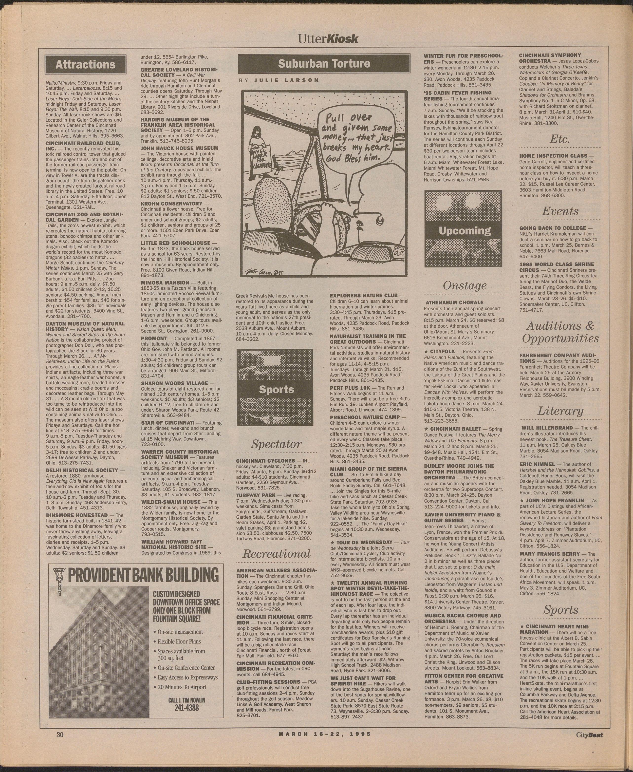 The season of season-announcements is here. This week, Cincinnati Playhouse in the Park and Riverbend Music Center released their lineups. The Playhouse’s 1995-96 season, unveiled in this issue, ranges from Agatha Christie’s The Mousetrap to Frank McGuinness’ Someone Who’ll Watch Over Me (about three men held hostage in Beirut) to Charles Dickens’A Christmas Carol. (See Cover Story, Pages 8-10.) Riverbend’s schedule generally runs from late spring until early fall, and an ad selling subscriptions will appear in Sunday’s Cincinnati Enquirer.