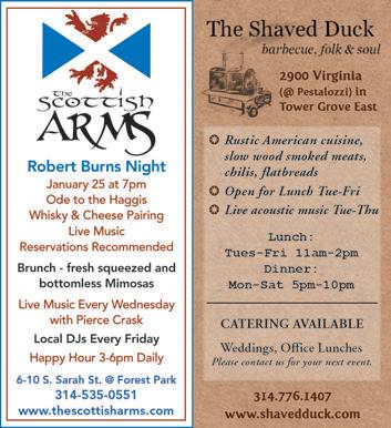 Many of the attractions at Joe Edwards’ annual Loop Ice Carnival are food- and drink-related. The s’mores roast at Craft Alliance is always fun. The Cosmonauts on Ice vodka-sampling event – featuring vodka cocktails, shot glasses made of ice, hors d’oeuvres and hot chocolate on the cool rooftop terrace bar at the Moonrise Hotel – is a crowd-pleaser, too. Then there are all the food and drink specials in The Loop bars and restaurants to coincide with the fun. On Friday night, the Snow Ball at the Moonrise includes a buffet dinner, allwhite attire and the crowning of Ice King and Queen. The eclectic attractions on Saturday include ice slides, a putt-putt pub crawl, ice cubes with money and chocolate prizes inside, a temporary tattoo scavenger hunt, ice carving demos, street performers, those dancing hula-hoop gals, human dogsled races and a video-game lounge. Visit the website for locations and times for each event.