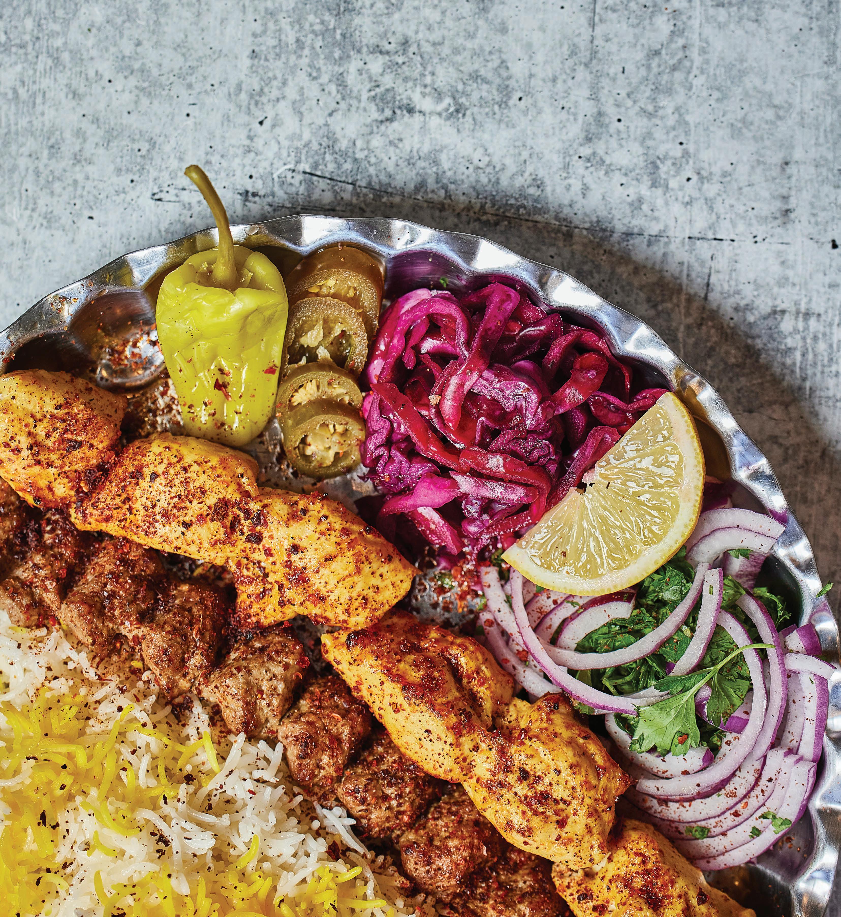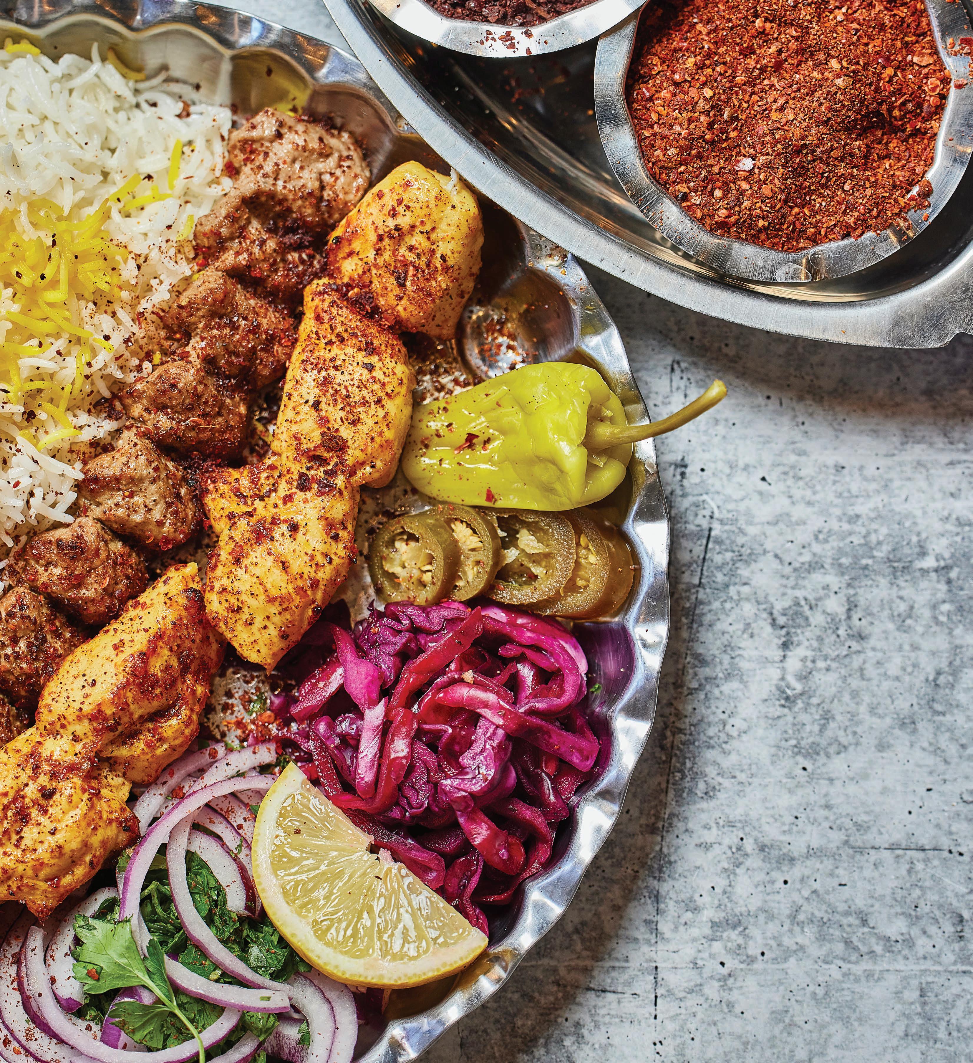 The bakhtiari platter at Ehsani’s Hot Kabob is ideal for sharing, serving up classic Persian grilled meats atop a generous mound of basmati and saffron rice. The tender joojeh (chicken tenderloin) is marinated in saffron and yogurt, while seasoned ground beef and lamb are the basis for the mouthwatering koobideh. The server will offer to brighten the dish with a scattering of tart sumac and a mix of other spices. Accept both – in fact, ask to have a dish of the sumac and spices left at the table so you can add more if you so desire.