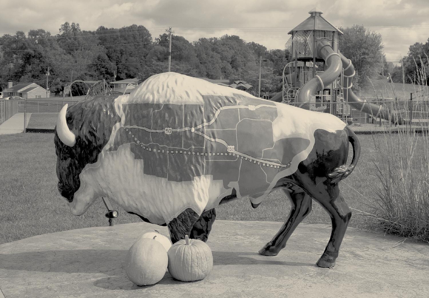 It generally follows U.S. 150 from Floyds Knobs on the highway designated as one of “Indiana’s Historic Pathways,” the signs on the shoulder illustrated with a buffalo. Along the way, too, there is ample evidence of people’s familiarity with what the route once was — the statue of a buffalo in a schoolyard, more signs, the Buffalo Trace Park at the edge of Palmyra where there is one preserved stretch of the actual trace. I’ve driven the stretch through Greenville, Fredericksburg, Paoli, Loogootee, all the way to Vincennes, to the Lincoln monument on the far side of the river in Illinois. I thought, when my third great-grandfather, Henry Henson, joined the Indiana infantry during the Civil War, he followed this route from French Lick to Louisville, before continuing on to the Battle of Perryville. He’s buried up there, outside French Lick, not far from the trace itself.