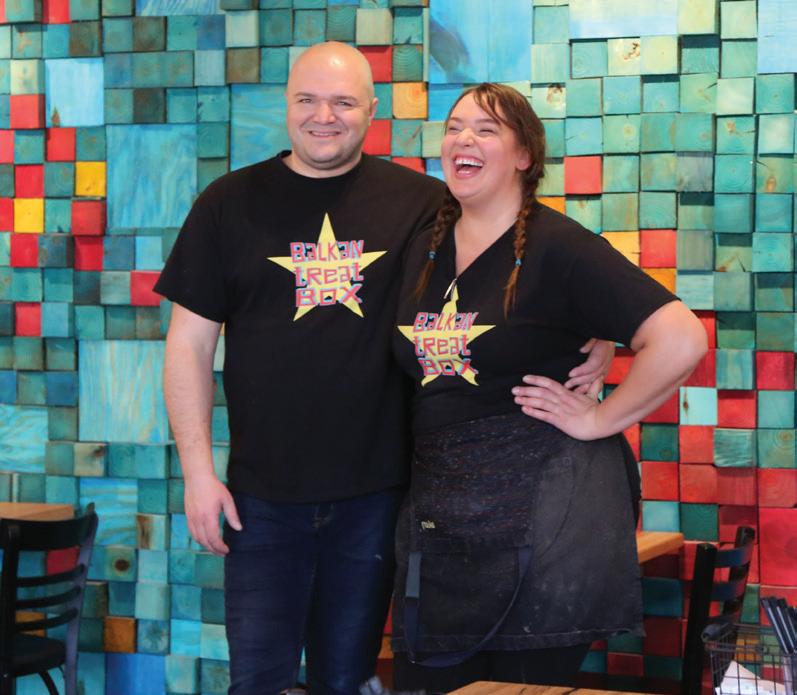 right: balkan treat box owners edo and loryn nalic somun cooking in the wood-fired oven at balkan treat box