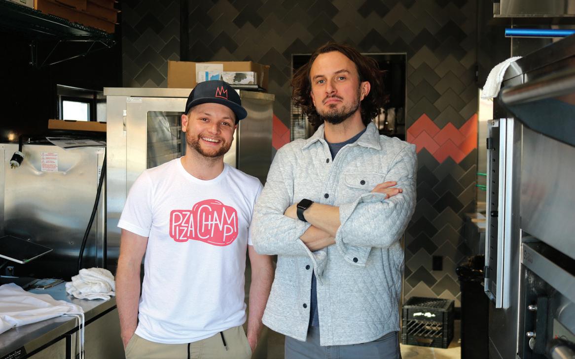 clockwise, from top: dishes at westchester, cocktails at westchester, from left: adam altnether and chris kelling of pizza champ, triple pepperoni at pizza champ