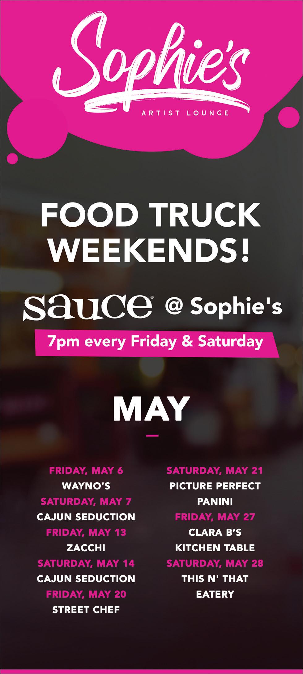 Friday and Saturday nights – 7 p.m., Sophie’s Artist Lounge, 3333 Washington Ave., Suite 102, St. Louis, 314.710.5647, Facebook: Sauce @ Sophie’s Food Truck Weekends