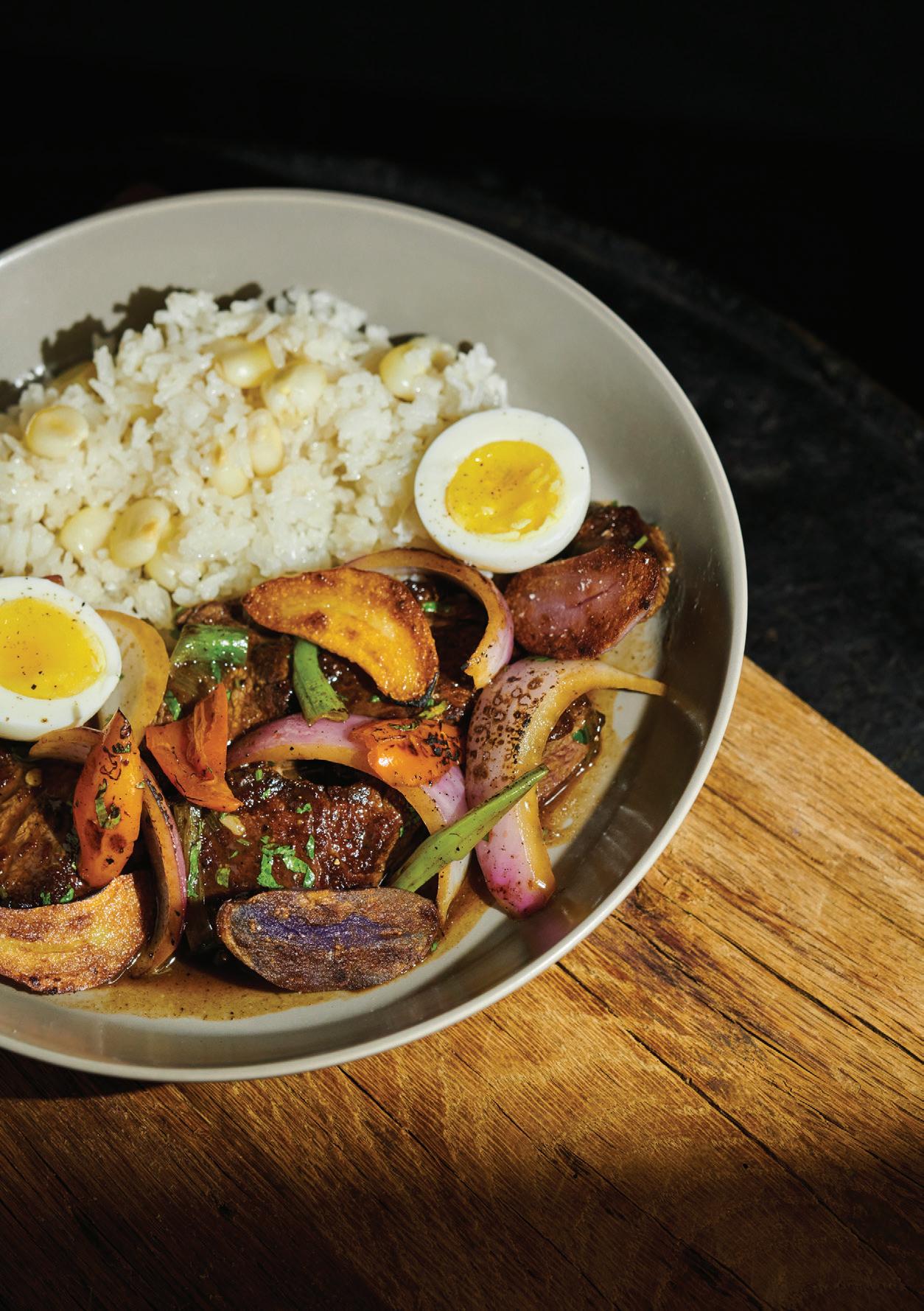 lomo saltado, stir-fried rib-eye with aji amarillo chiles, onions and potatoes served with garlic rice and soft boiled egg