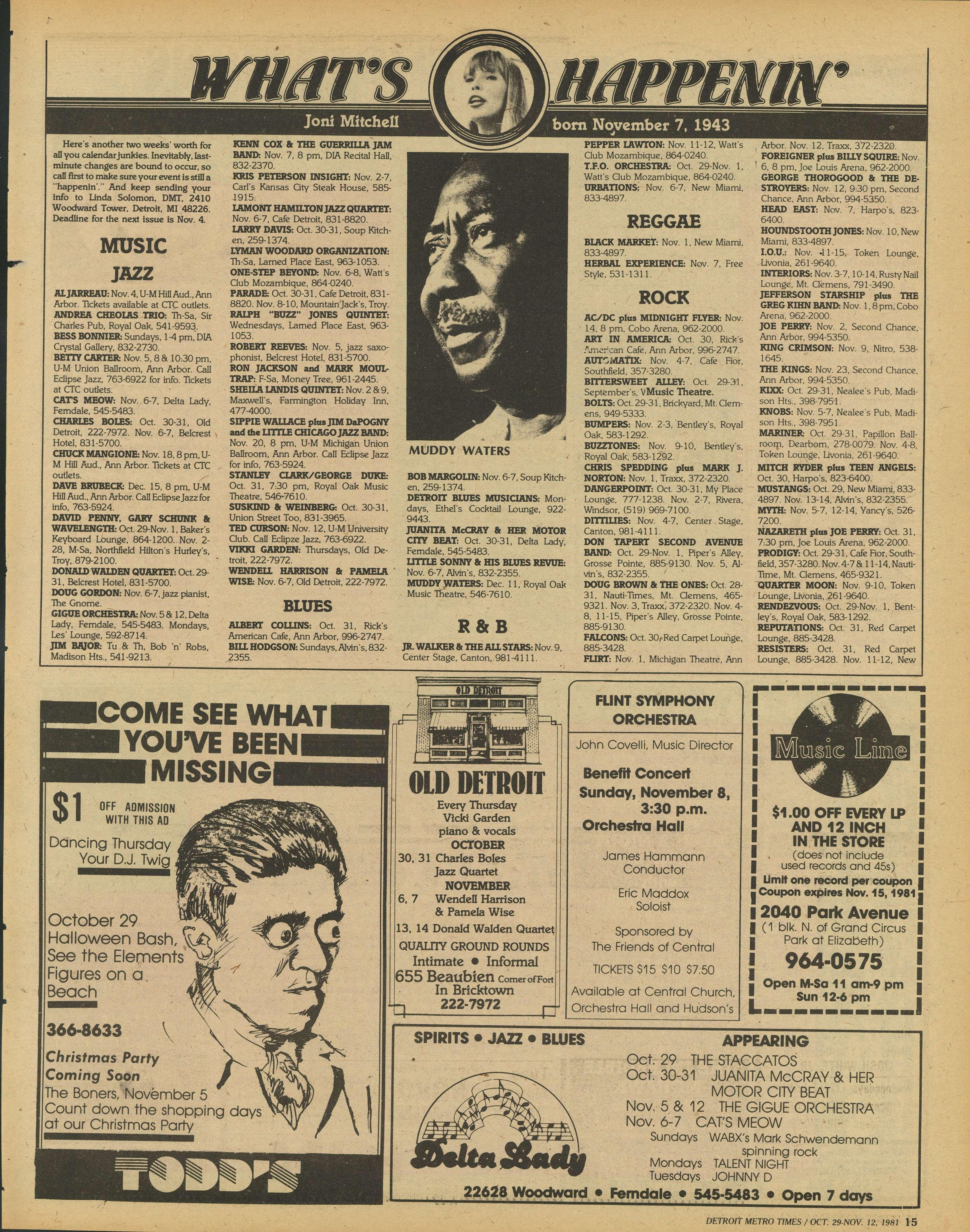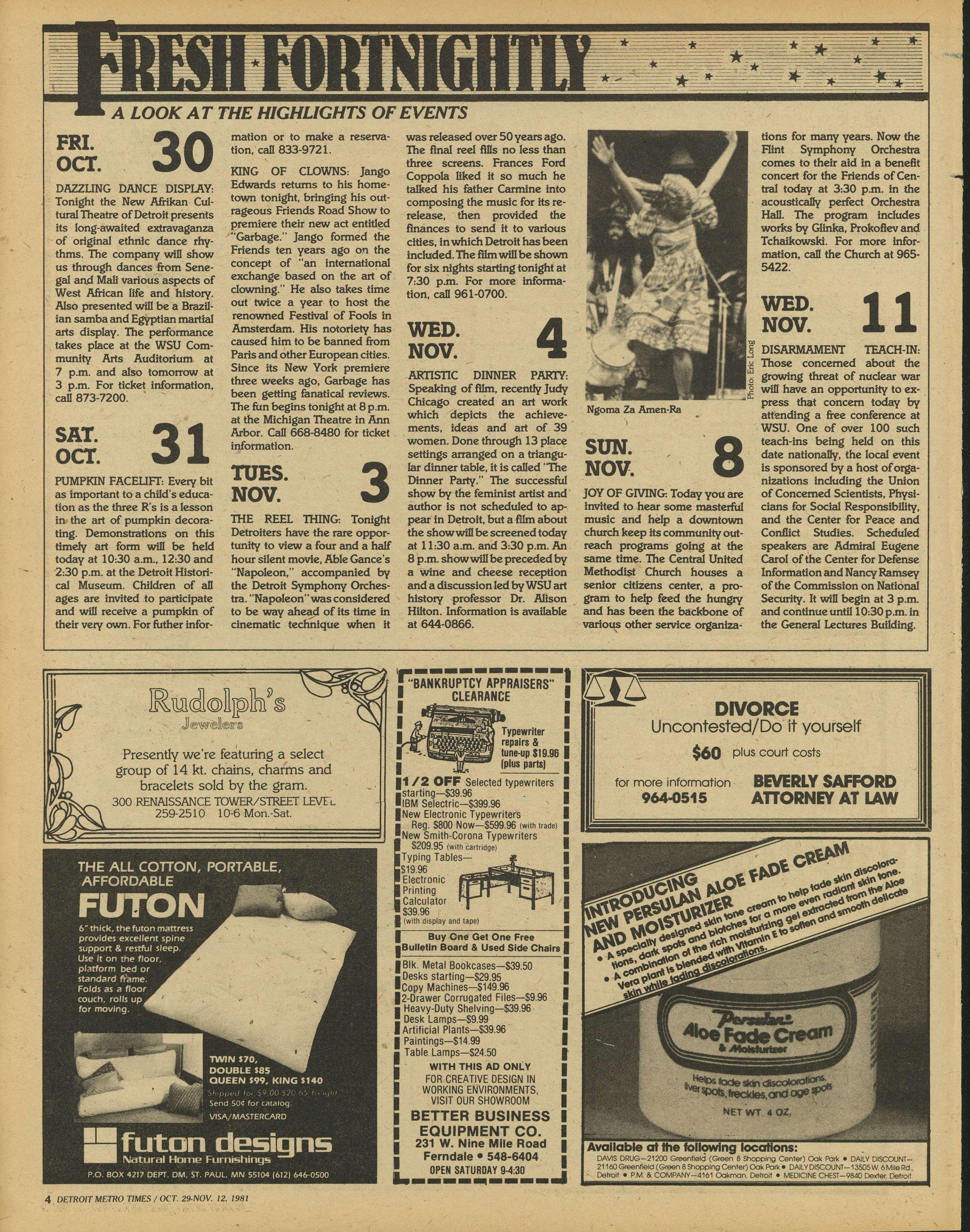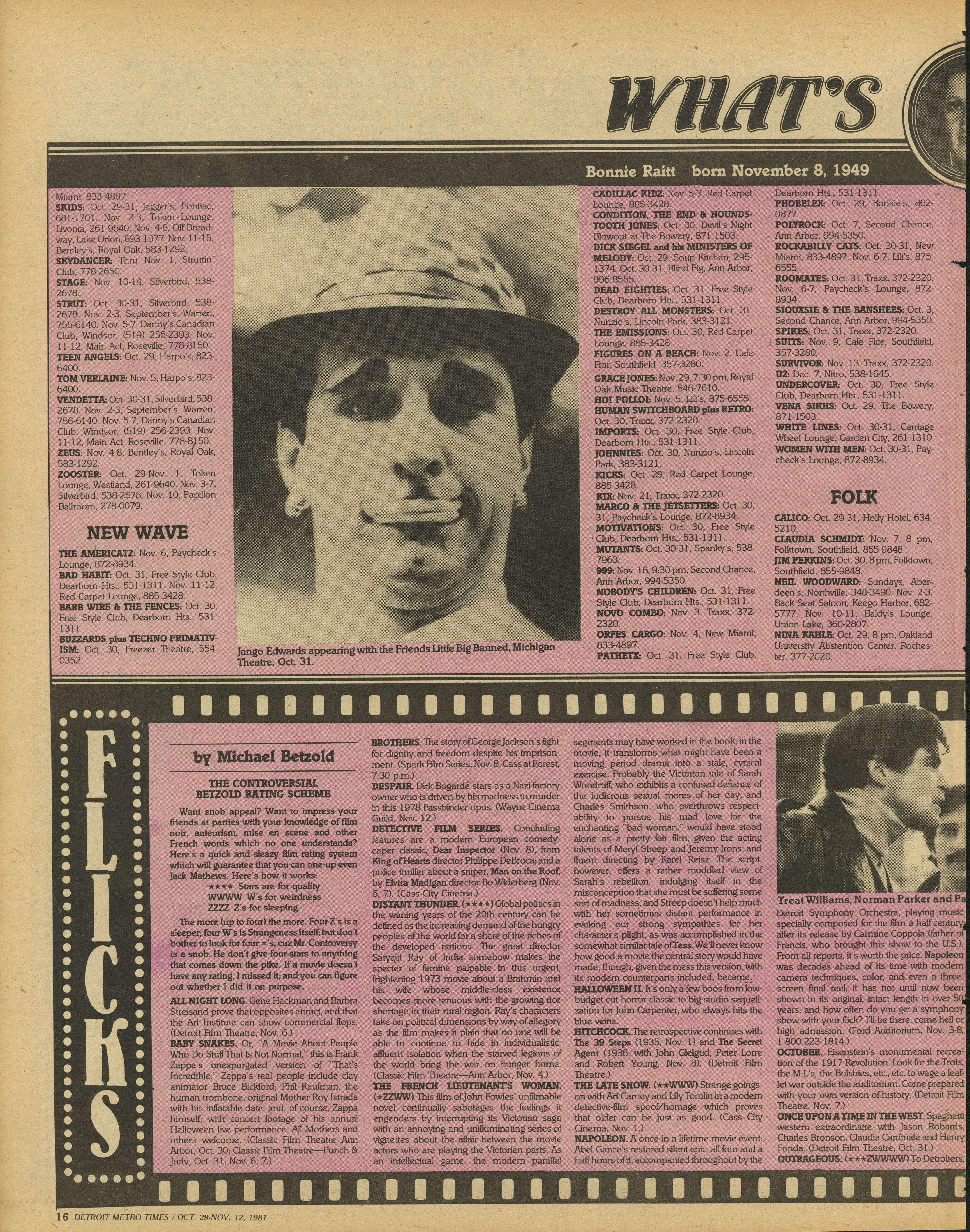 Copyright © 1981, Detroit Metro Times. All rights reserved. Reproductibn in whole or in part without permission of the publisheris prohibited. Publisher does not assume liability for unsolicited manuscripts or material. Manuscripts or material unaccompanied by stamped, self-addressed envelope will not be returned. All editorial, advertising and business WHAT'S