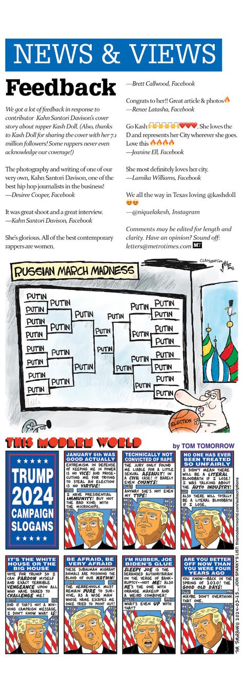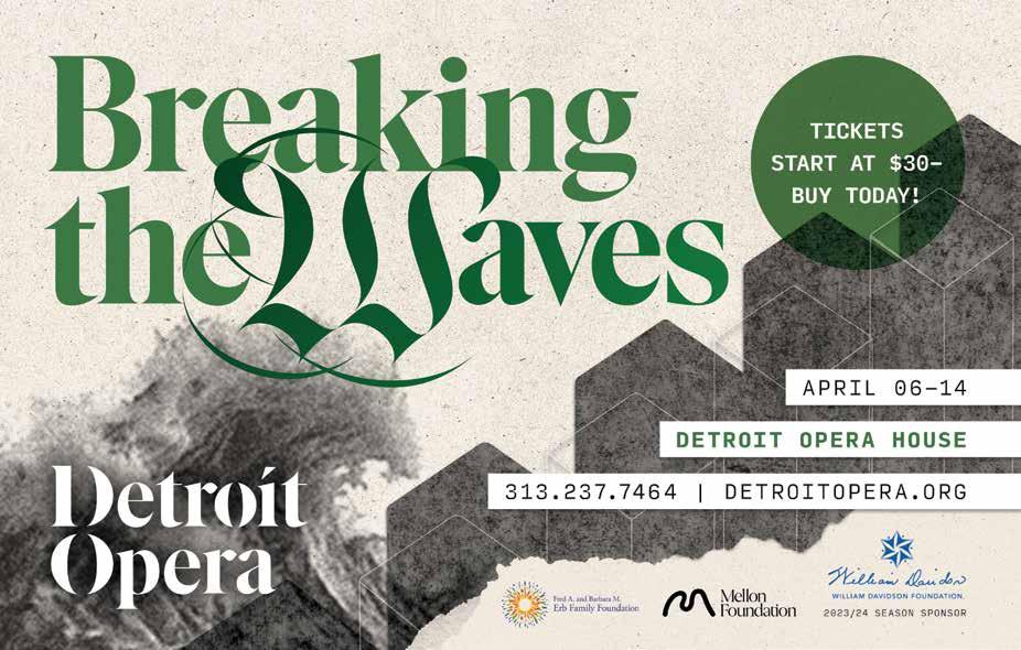 4 March 27-April 2, 2024 | metrotimes.com News & Views Feedback 6 News 8 Lapointe 12 Cover Story Detroit Institute of Arts works to return Indigenous objects 16 What’s Going On Things to do this week 21 Music Local Buzz 24 Food Review 28 Culture Arts ...................................... 30 Film 32 Savage Love 36 Horoscopes 38 Vol. 44 | No. 23 | MARCH 27-APRIL 2, 2024 Copyright: The entire contents of the Detroit Metro Times are copyright 2024 by Big Lou Holdings, LLC. Reproduction in whole or in part without written permission of the publisher is prohibited. The publisher does not assume any liability for unsolicited manuscripts, materials, or other content. Any submission must include a stamped, self-addressed envelope. All editorial, advertising, and business correspondence should be mailed to the address listed below. Prior written permission must be granted to Metro Times for additional copies. Metro Times may be distributed only by Metro Times’ authorized distributors and independent contractors. Subscriptions are available by mail inside the U.S. for six months at $80 and a yearly subscription for $150. Include check or money order payable to: Metro Times Subscriptions, P.O. Box 20734, Ferndale, MI, 48220. (Please note: Third Class subscription copies are usually received 3-5 days after publication date in the Detroit area.) Most back issues obtainable for $7 prepaid by mail. Printed on recycled paper 248-620-2990 Printed By EDITORIAL Editor in Chief - Lee DeVito Investigative Reporter - Steve Neavling Staff Writer - Randiah Camille Green Digital Content Editor - Layla McMurtrie ADVERTISING Associate Publisher - Jim Cohen Regional Sales Director - Danielle Smith-Elliott Sales Administration - Kathy Johnson Account Manager, Classifieds - Josh Cohen BUSINESS/OPERATIONS Business Support Specialist - Josh Cohen Controller - Kristy Dotson CREATIVE SERVICES Creative Director - Haimanti Germain Art Director - Evan Sult Graphic Designer - Aspen Smit CIRCULATION Circulation Manager - Annie O’Brien DETROIT METRO TIMES P.O. Box 20734 Ferndale, MI 48220 metrotimes.com GOT A STORY TIP OR FEEDBACK? tips@metrotimes.com or 313-202-8011 WANT TO ADVERTISE WITH US? 313-961-4060 QUESTIONS ABOUT CIRCULATION? 586-556-2110 GET SOCIAL: @metrotimes DETROIT DISTRIBUTION Detroit Metro Times is available free of charge, limited to one copy per reader Verified Audit Member BIG LOU HOLDINGS Executive Editor - Sarah Fenske Vice President of Digital Services - Stacy Volhein Digital Operations Coordinator - Elizabeth Knapp Director of Operations - Emily Fear Chief Financial Officer - Guillermo Rodriguez Chief Executive Officer - Chris Keating National Advertising - Voice Media Group 1-888-278-9866 vmgadvertising.com On the cover: Photo courtesy of the DIA