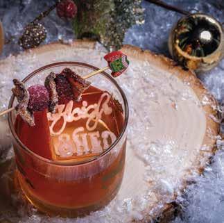 The two businesses have been planning their collaborative event since June, and the effort shows in their specialty menus created for the pop-up. The cocktail list from 4 Hands focuses on showing off their portfolio of spirits as well as guest experience. The Resting Grinch Face is one of owner Kevin Lemp’s favorites, made up of 1220 Spirits’ Encrypted Vodka, plus white cranberry, triple sec, simple syrup and lime juice. Upon ordering, a server comes to the table with the drink in one hand and green cotton candy in the other. Guests watch as the cotton candy dissolves in the cocktail, transforming it into something perfect for the Mean One himself. Withered Oak’s rye is a substantial component of the cocktail menu, making appearances in Max on the Rocks (a One Antler Old-Fashioned), the caramel appleinspired Sugar & Spice and the Midnight Noel, which also features amaro, plus