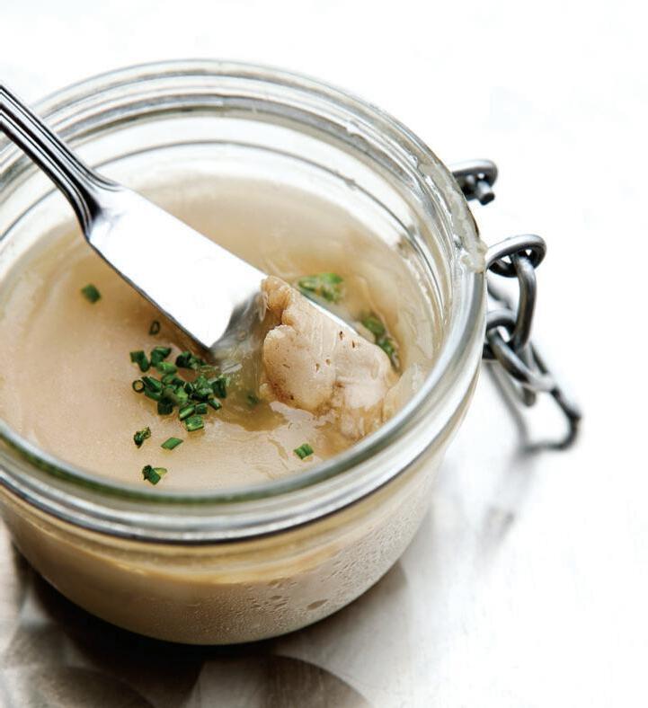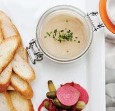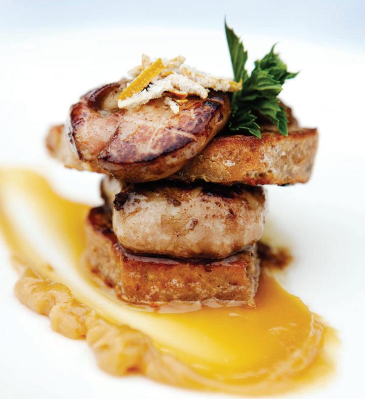 a foie pâté using the French torchon technique – French for “towel,” as it involves a fourday-long process during which Hemp soaks the liver in milk, rolls it in a cloth, poaches it, rolls it again and then chills it. The now near-perfect foie later gets whipped into a lighterthan-air pâté that melts lazily and seductively with every bite. In a nod to tradition, Hemp caps it with duck fat and clarified butter, which you can eat if you’re feeling particularly decadent. (Extra calories, for sure. But at this point, what’s a few hundred more?) It’s a worthy preparation, and one that comes straight from the history books, not to mention the kitchens of The French Laundry.