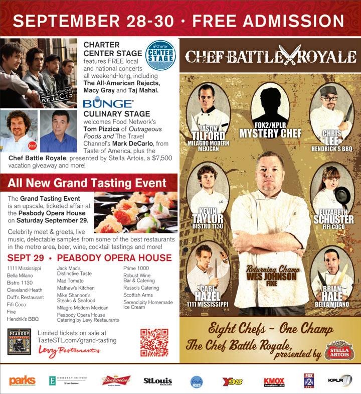 the return of downtown’s taste of St. Louis food-centric extravaganza promises fun in every direction. Sauce Magazine’s restaurant row features fare from great places like bistro 1130, bogart’s Smokehouse, Hank’s Cheesecakes, Harvest, Kakao Chocolate, Milagro Modern Mexican, Oceano bistro, Waffle-licious and about two dozen more. Food celebrities like tom pizzica of Food Network’s Outrageous Foods, Marc bynum of Food Network’s Chopped and Mark DeCarlo of travel Channel’s Taste of America will offer demos and commentary, while the Chef battle royale will pit 7 of the area’s most accomplished culinary innovators against one another onstage. Don’t forget to check out the Art & Wine Walk, the bunge battle of the Food trucks, a Grand tasting Event, live performances by the All-American rejects and other acts, and the expansive Kid City. Fun, fun, fun.