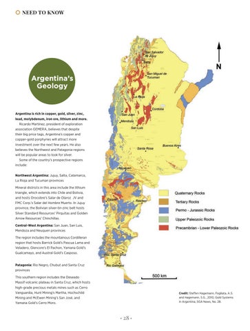 Argentina is rich in copper, gold, silver, zinc, lead, molybdenum, iron ore, lithium and more. Ricardo Martínez, president of exploration association GEMERA, believes that despite their big price tags, Argentina’s copper and copper-gold porphyries will attract more investment over the next few years. He also believes the Northwest and Patagonia regions will be popular areas to look for silver. Some of the country’s prospective regions include: Northwest Argentina: Jujuy, Salta, Catamarca, La Rioja and Tucuman provinces Mineral districts in this area include the lithium triangle, which extends into Chile and Bolivia, and hosts Orocobre’s Salar de Olaroz JV and FMC Corp.’s Salar del Hombre Muerto. In Jujuy province, the Bolivian silver-tin-zinc belt hosts Silver Standard Resources’ Pirquitas and Golden Arrow Resources’ Chinchillas. Central-West Argentina: San Juan, San Luis, Mendoza and Neuquen provinces The region includes the mountainous Cordilleran region that hosts Barrick Gold’s Pascua Lama and Veladero, Glencore’s El Pachon, Yamana Gold’s Gualcamayo, and Austral Gold’s Casposo. Patagonia: Rio Negro, Chubut and Santa Cruz provinces This southern region includes the Deseado Massif volcanic plateau in Santa Cruz, which hosts high-grade precious metals mines such as Cerro Vanguardia, Hunt Mining’s Martha, Hochschild Mining and McEwen Mining’s San José, and Yamana Gold’s Cerro Moro.