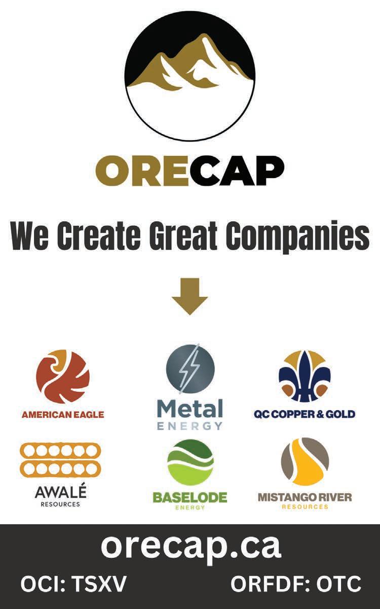 Orecap seeks Special Situation investments in the natural resource sector that o er shareholders diverse exposure to high returns in precious and critical metal assets and businesses. Orecap has significant equity positions in portfolio companies, such as American Eagle Gold (AE:TSXV | AMEGF:OTCQB), QC Copper and Gold (QCCU:TSXV | QCCUF:OTCQB), Mistango (MIS:CSE) and Awale Resources (ARIC:TSXV) in addition to owning a broad portfolio of land packages focussed on gold, copper and zinc. Agnico Eagle Mines Limited is a 9.9% shareholder and holds an option to acquire up to a 75% interest in Orecap’s Knight and McGarry projects in exchange for spending $60 million on the Projects.
