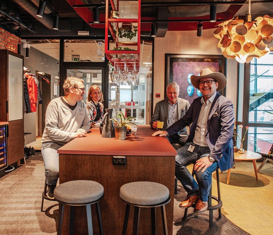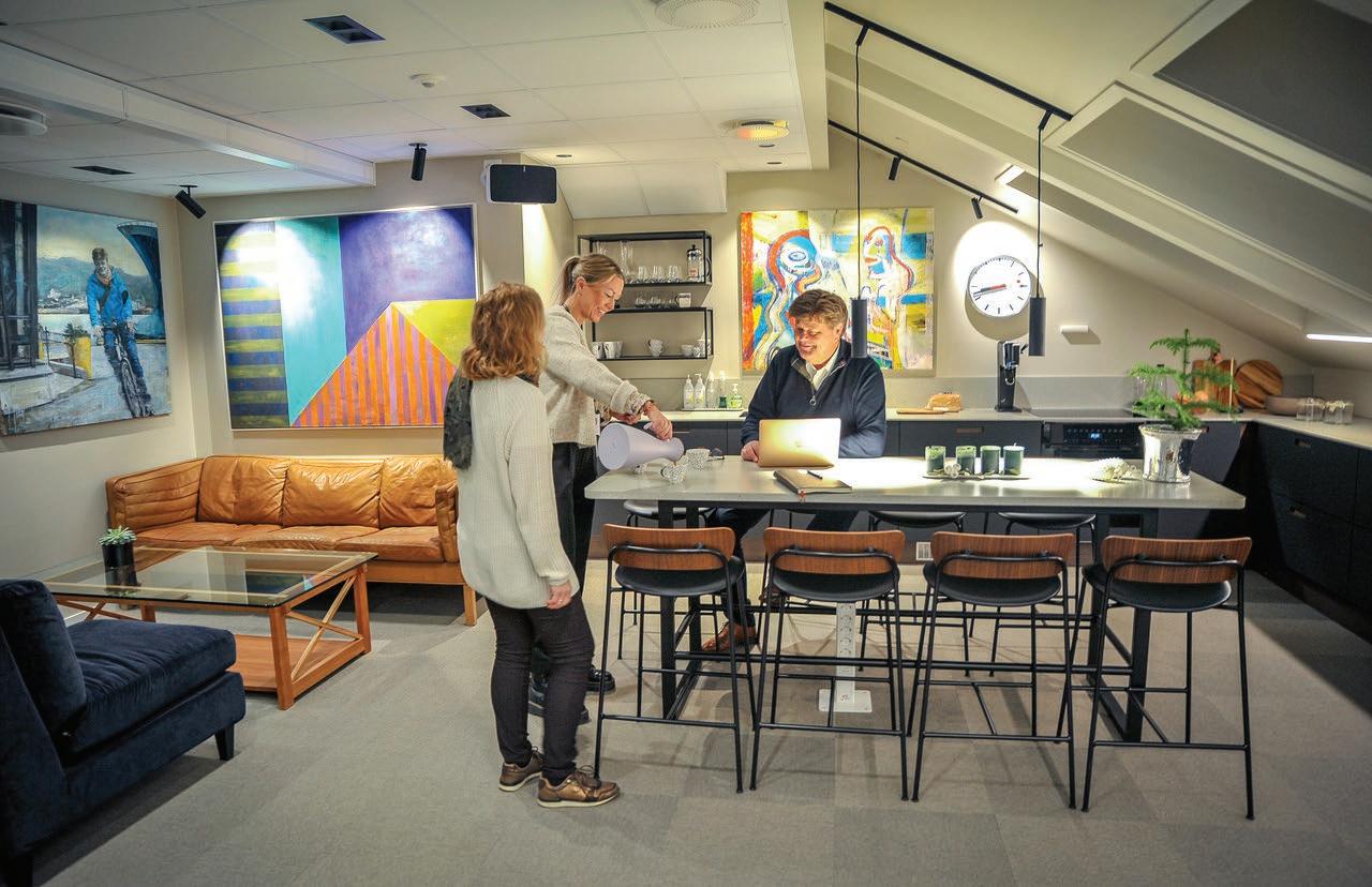 Fin møteplass for morgenkaffen. Fra vestre controller Siw Meløysund og relasjonssjef – marked og kundekontakt Kine Uttakleiv i Hundholmen Byutvikling og leder Morten Jakhelln for samfunn og utvikling i Christian Jakhelln.