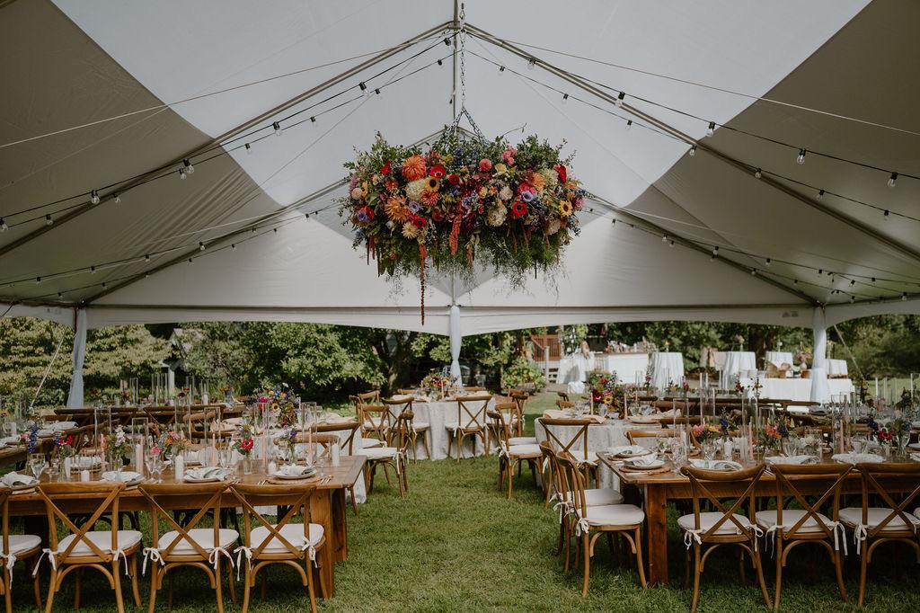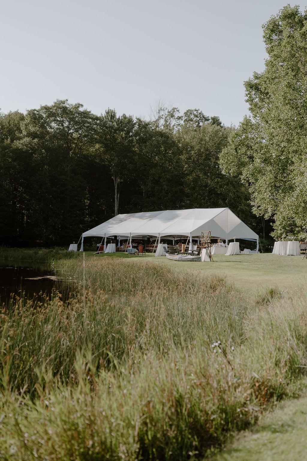 The Stillwater is our version of a Sailcloth tent. It is a lighter look than our traditional blockout tents, giving an airy, brighter feeling. This tent is the wedding tent you are looking for. It comes standard with Cherry finished poles throughout, and 5′ white flags flying high on the peaks. Available in 44′ x 43′ for a circle tent and up to 44′ x 103′