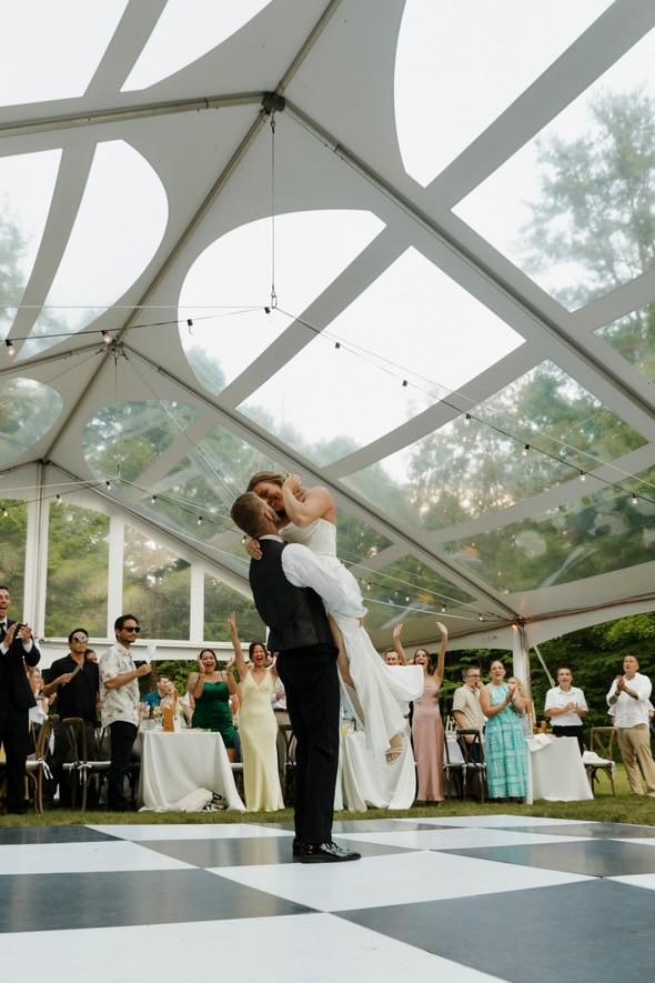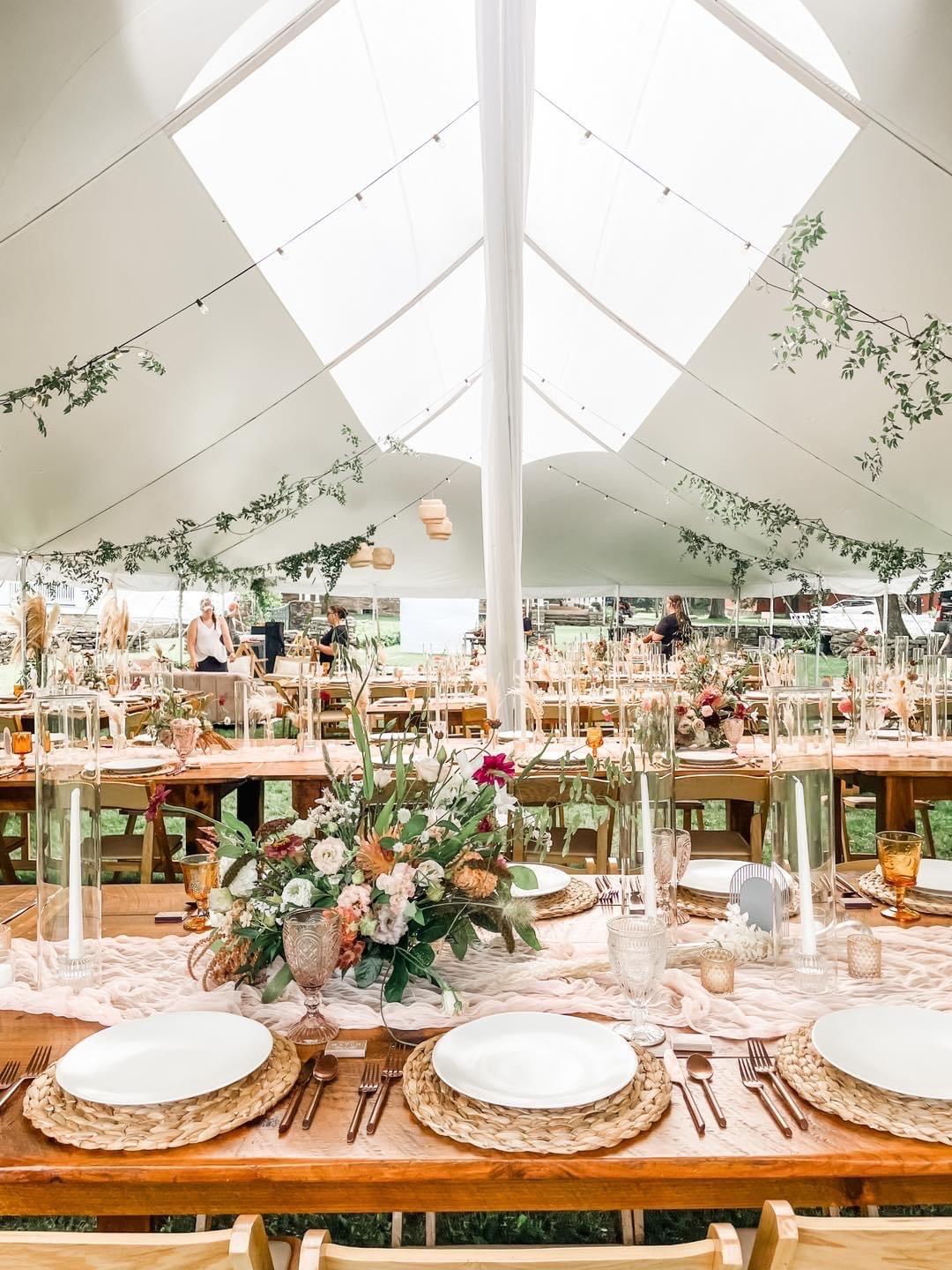 The Stillwater is our version of a Sailcloth tent. It is a lighter look than our traditional blockout tents, giving an airy, brighter feeling. This tent is the wedding tent you are looking for. It comes standard with Cherry finished poles throughout, and 5′ white flags flying high on the peaks. Available in 44′ x 43′ for a circle tent and up to 44′ x 103′
