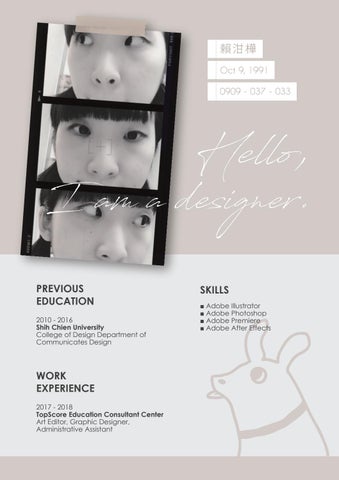 I am a designer. PREVIOUS EDUCATION 2010 - 2016 Shih Chien University College of Design Department of Communicates Design