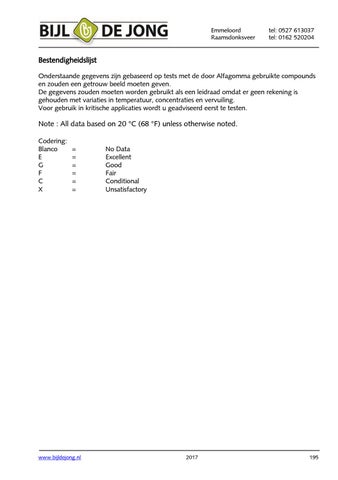 Bestendigheidslijst Onderstaande gegevens zijn gebaseerd op tests met de door Alfagomma gebruikte compounds en zouden een getrouw beeld moeten geven. De gegevens zouden moeten worden gebruikt als een leidraad omdat er geen rekening is gehouden met variaties in temperatuur, concentraties en vervuiling. Voor gebruik in kritische applicaties wordt u geadviseerd eerst te testen.