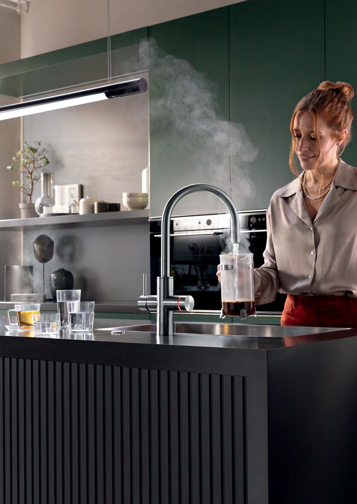 Franke’s Mythos Water Hub 5 and 6-in-1 taps feature a compact one box system that sits neatly under the sink