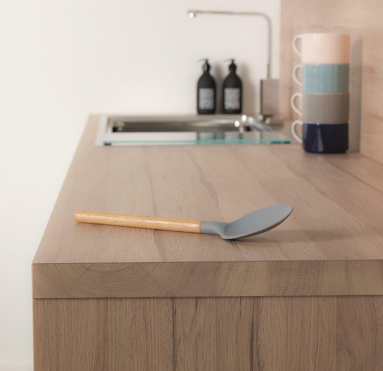 Stamford Oak worksurface in ultramatt texture with new end-grain edging strip and matching Stamford Oak splashback. All with Bushboard Santitized® Worksurface