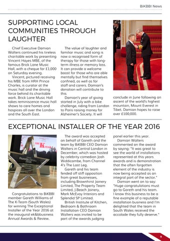 installer magazine the issue 8 - winter 2017 The official magazine of The British Institute of KBB Installation PEAKING AT THE RIGHT TIME! FOLLOWING A GREAT YEAR FOR THE INSTITUTE, BiKBBI CEO NOW AIMS TO CONQUER EVEREST WILSONART BECOMES LATEST SPONSOR! EXCLUSIVE INTERVIEW WITH B & Q HEAD OF INSTALLATION SERVICES, JOHN EASON